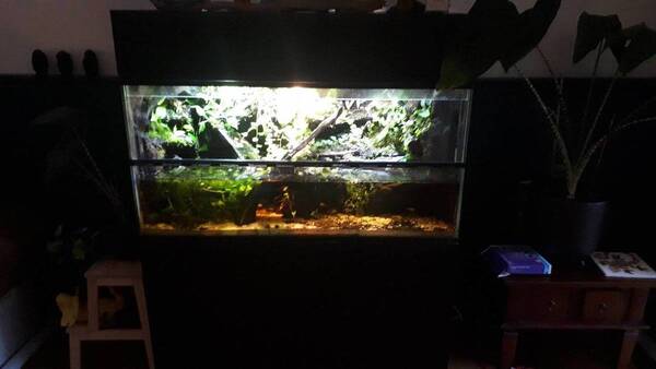 Waterhoogte van het vivarium zal 35cm worden, voorkant glas loopt door tot 40cm hoogte, met een waterval die vanaf 120cm hoog naar beneden zal lopen.