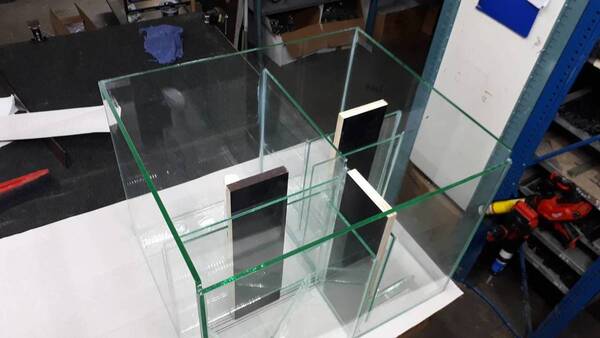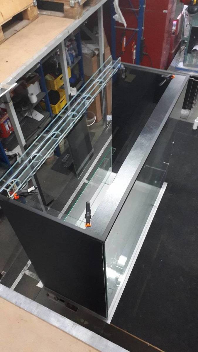 Toch maar vandaag alvast geplakt, buitenwanden is 8mm glas, alles binnenin 6mm. Dit in 1x plakken was bijzonder pittig, maakt een foutje door de scheiding in het midden per ongeluk een slag gedraaid te plaatsen, toen ik er achter kwam snel er uit gehaald en met een kwartslag draai er weer ingezet. Daardoor zie je nu wel wat geknoei met kit op die plaat maar ach, het komt op een plek waar je het niet ziet en met een Stanley mesje haal ik het meest overtollige wat op die kant zit wel even weg. (voor het visuele, niet in naden waar het waterdicht anders gevaar loopt)