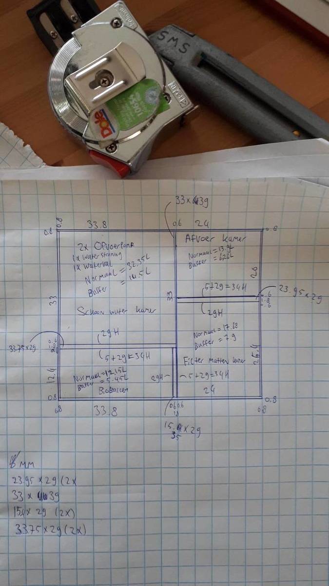 Bioloog zal hoe dan ook hoger worden dan wat het aan inhoud heeft te verwerken om zodoende als wateropvang te dienen als stroom uit valt. Volgens mijn berekening zit ik met het vivarium op een inhoud van net geen 300L water, wat moet ongeveer de inhoud van de bioloog worden?