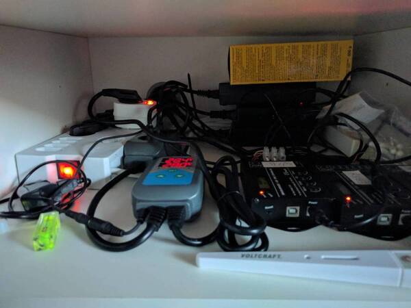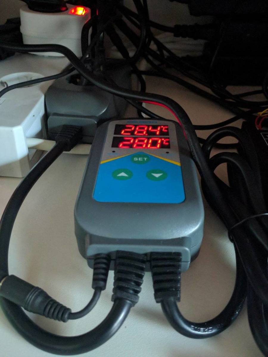 Daarna "netjes" alles in de kast aangesloten en de temperatuurvoeler naar het aquarium gebracht. Dit ging helemaal prima. De unit ging direct aan de slag om de gewenste temperatuur te bereiken. Omdat mijn thermostaten de bak nu op 28,4 hielden, bleef deze uiteraard continu branden omdat het gewenste setpoint niet bereikt werd.