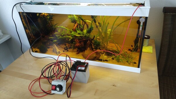 Blijkbaar kan Hydra niet tegen elektrolyse (oxidatiereactie). De overige dieren geven er niet om, de garnalen schransen rustig door. De Hydra zien we bij bosjes omvallen, dus dat is positief!