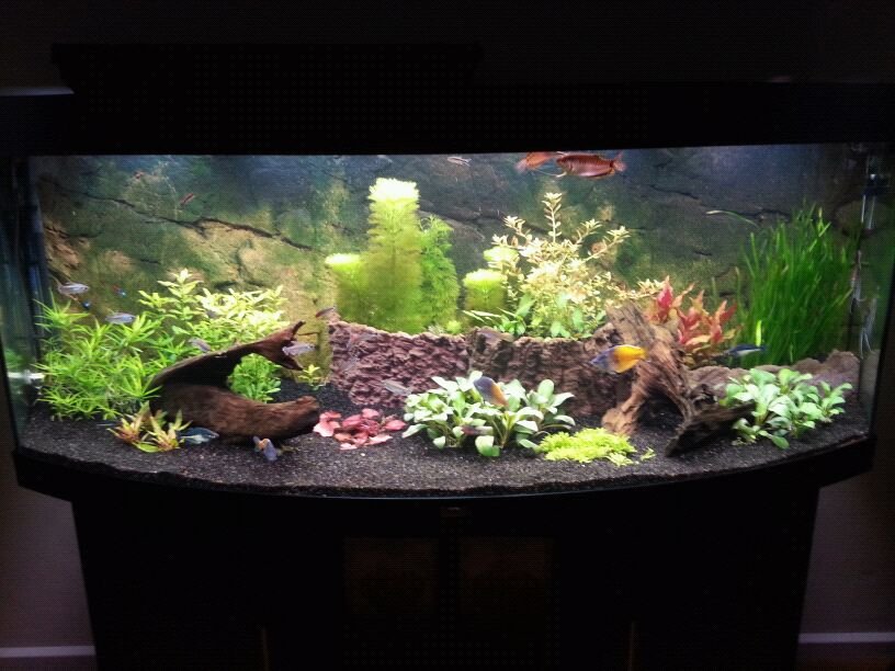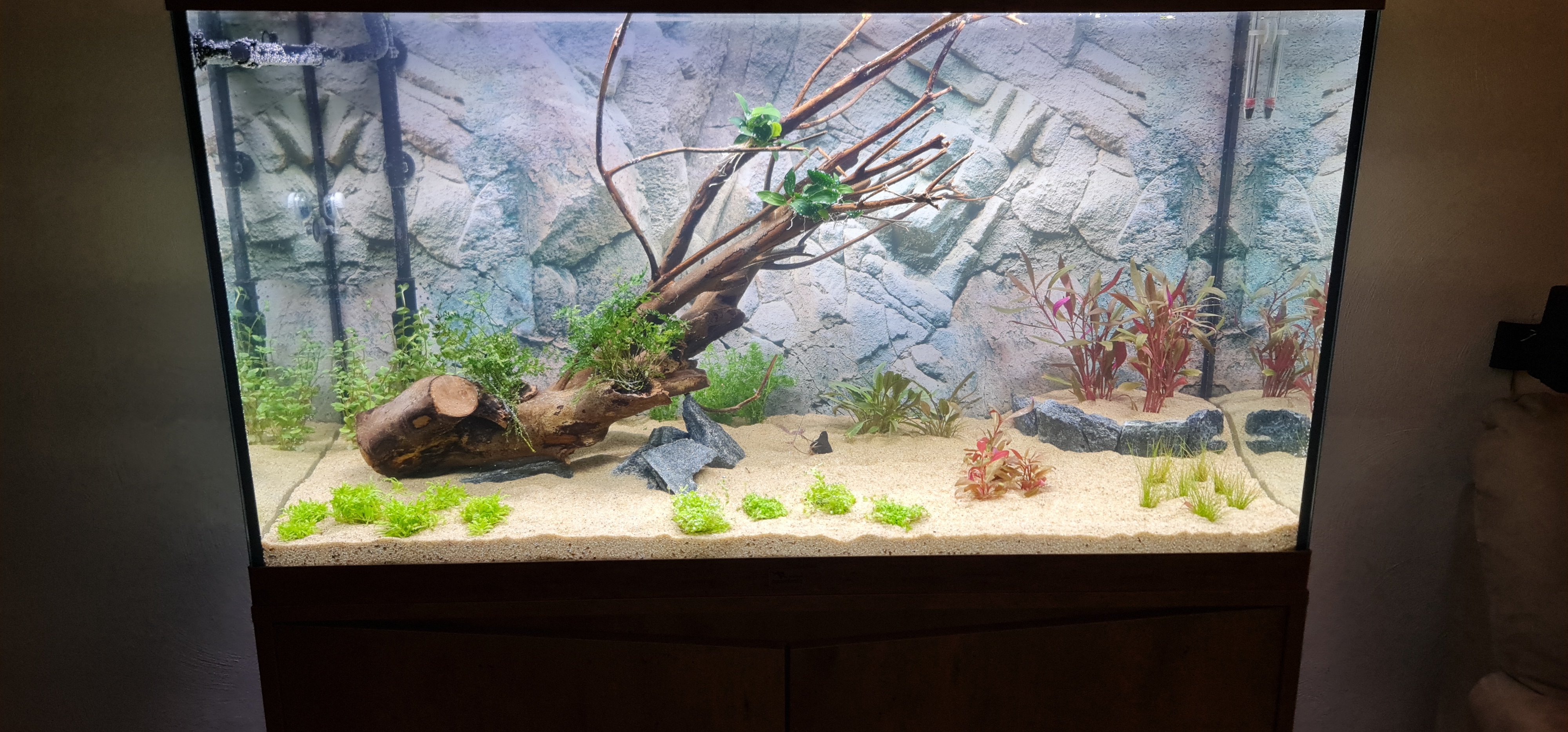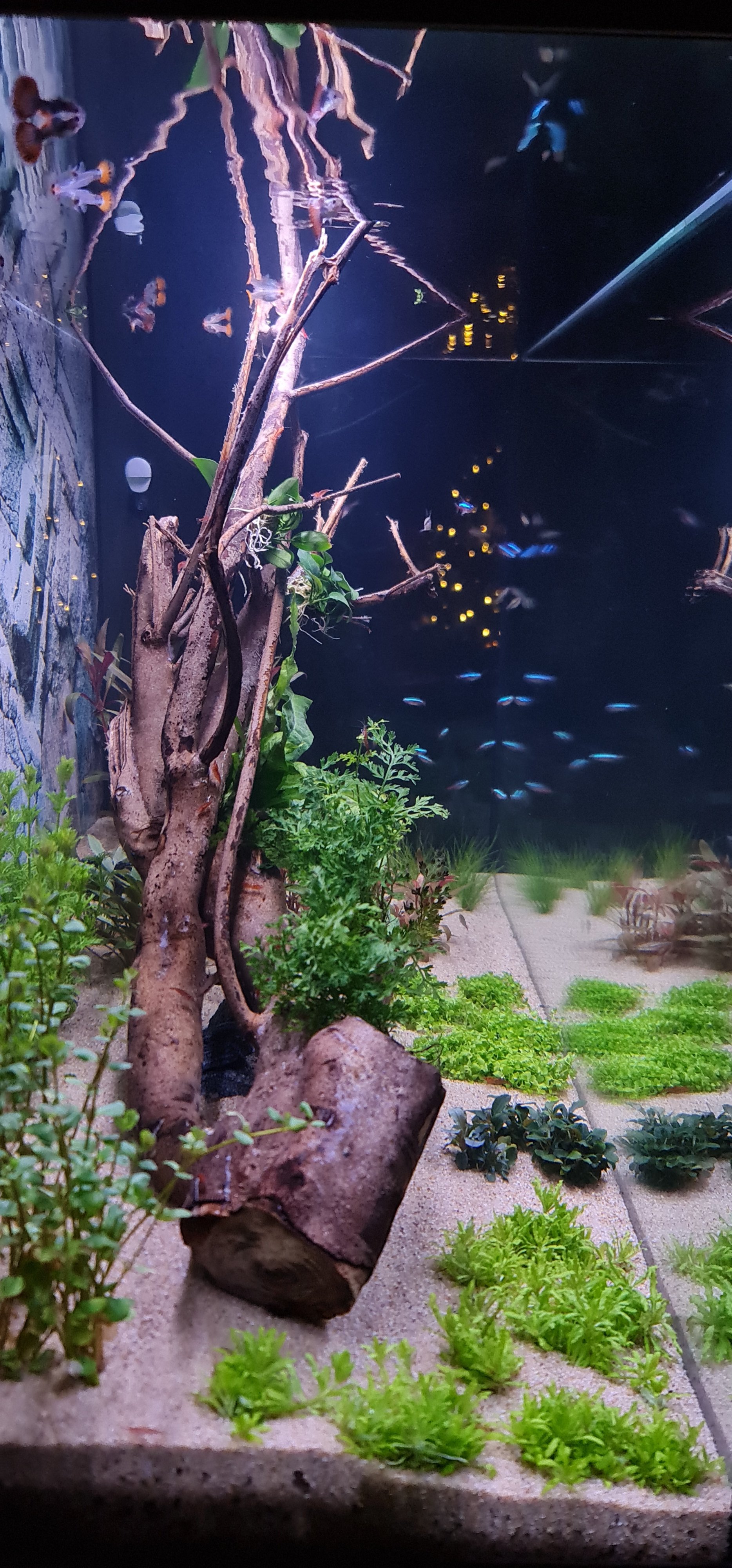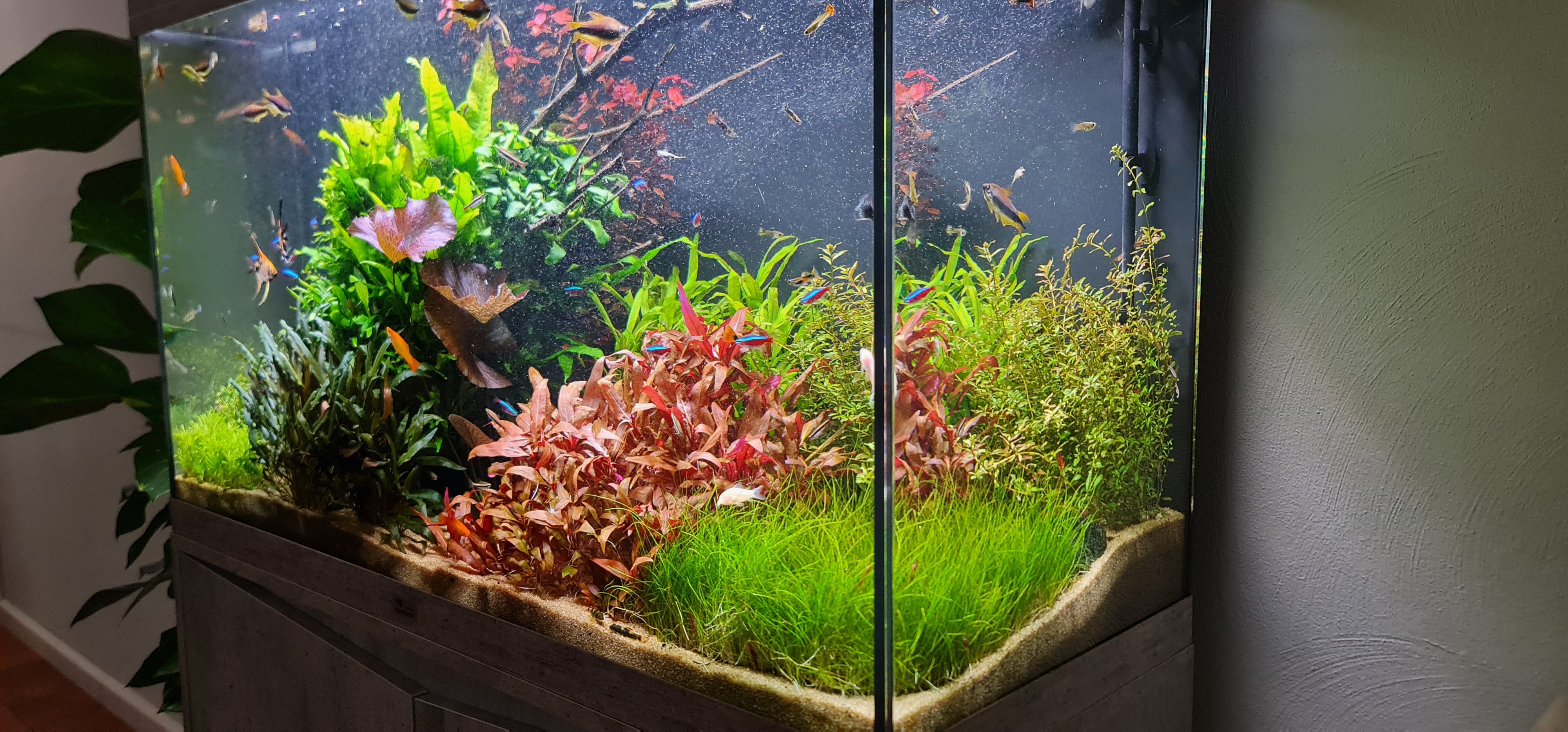 Wel zit ik nog te twijfelen om een lamp erbij te doen om de kleuren nog meer te versterken (vissen,planten) maar het gaat nu allemaal zo goed dat ik eigenlijk niks durf te veranderen.
