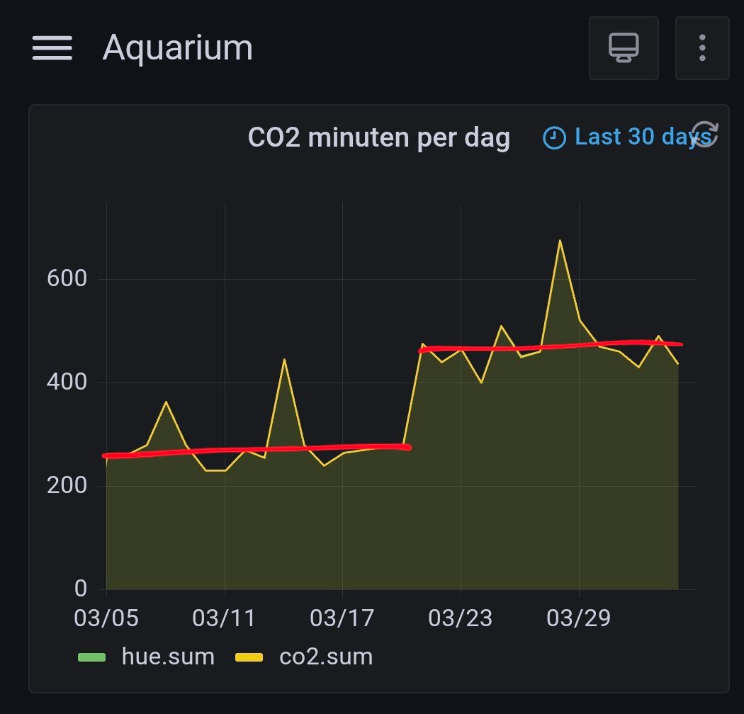 Mijn twee streamers (Sicce Nano 1000) staan nu alleen aan als de PH-controller CO2 gaat toevoegen (via reactor), dat is rond de 250 minuten per dag (gemiddelde voor de afgelopen 5 dagen)