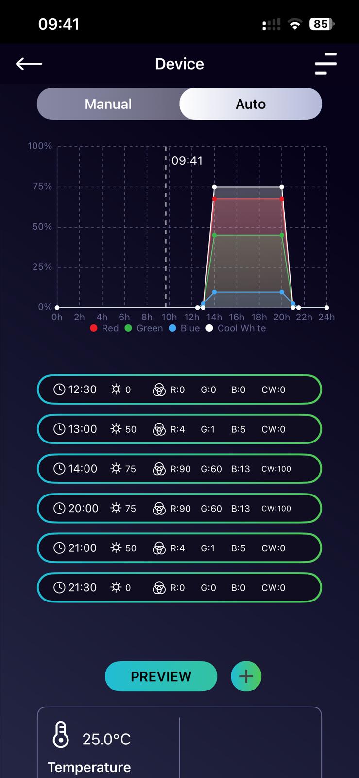 Verlichting heb ik in het begin veel te lang aan gehad (ruim 14 uur incl dimtijden). Deze heb ik teruggeschroefd naar 8 uur incl dimtijden. (van 13.00 tot 14.00 langzaam naar 75%, van 20.00 tot 21.00 langzaam naar 0%)