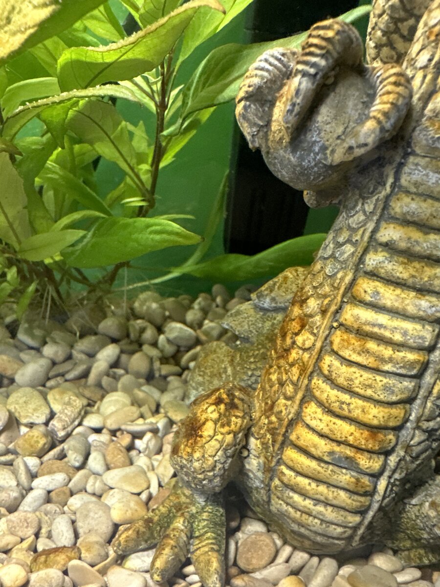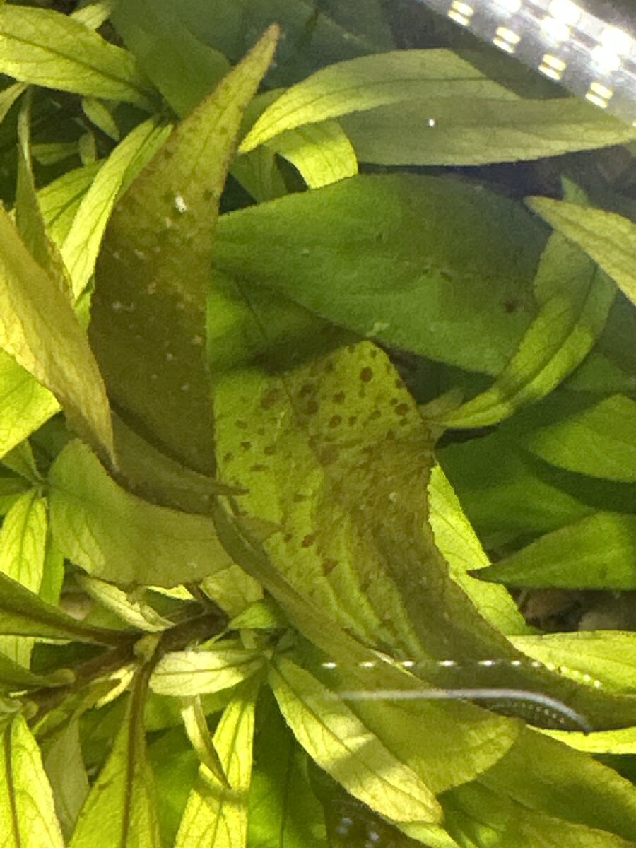 Op internet staat dat bruinalg zich vormt door te weinig licht of door te weinig water verversen. Het licht brandt 8-9 uur per dag en elke week wordt er 10-20 procent van het water ververst. Sinds 1 week ligt er ook een catappa blad in het aquarium.