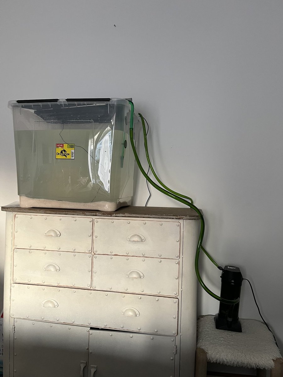 Kwa filter kan ik je de JBL 1502 aanraden! Echt een fijn filter, met sluiers zou ik ook altijd voor "overcapaciteit" in een filter zoeken. Dus een wat groter filter als wat de dierenspeciaalzaak vaak adviseert. Je zou er wat van je filtermedia uit je vijver in kunnen doen. Heb je toevallig al een druppeltestkitje voor als je straks een groot aquarium voor ze hebt zodat je ze er wel gelijk in kan doen maar wel de waterwaardes in de gaten kan houden ivm een nieuw filter+bodem.