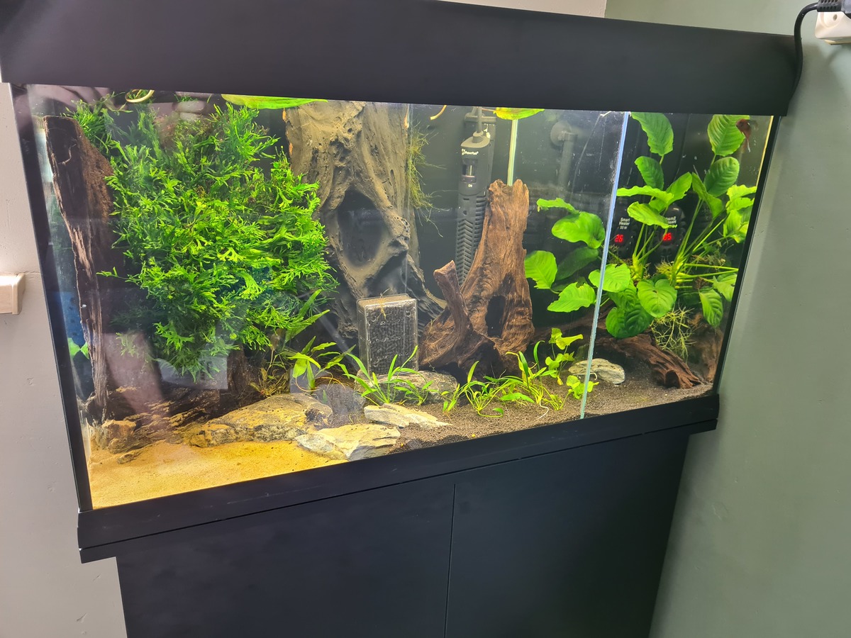 Voor het deel van meneer denk ik erover om een dennerle hoekfilter XL te plaatsen (of toch mijn sponsfilter te houden, al vind ik die een doorn in het oog), voor de garnalen zit het idee om mijn tetratec ex600 te plaatsen met een spons over de intake tegen de jonge garnaaltjes. Mochten ze er dan toch doorkomen, dan overleven die het ook wel in dit filter. Qua scape loopt nu het idee om de boomstronk van eerder weer in de bak te plaatsen. Die kan ik zo doorzagen voor een geheel. Qua inrichting verder weet ik het nog niet goed.