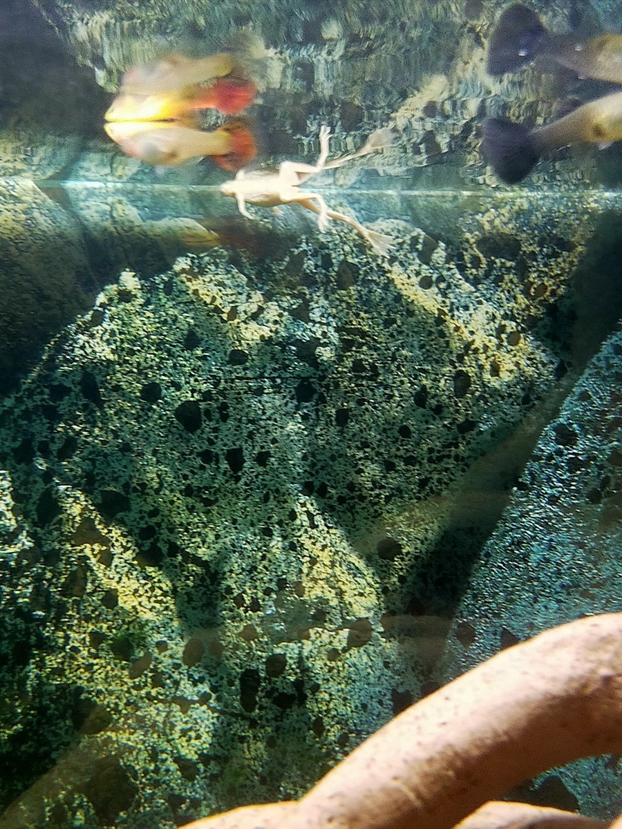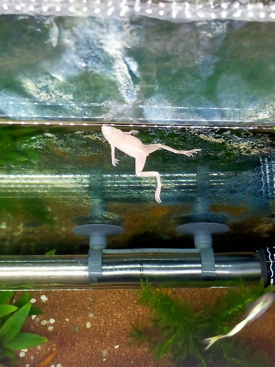 Ik snap niet wat ik kan doen, wat ik wel zie is dat hij best mager is (ondanks het goed voeren) en dat hij net zoals de dwergklauwkikkers uit mijn oude aquarium apart draait en niet naar de bodem kan.