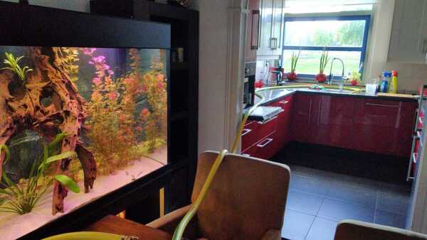 Die slang door de keuken is zo’n herkenbaar beeld, had bij m’n vorige aquarium de slang geklemd tussen de handvaten van de koelkast en vriezer??