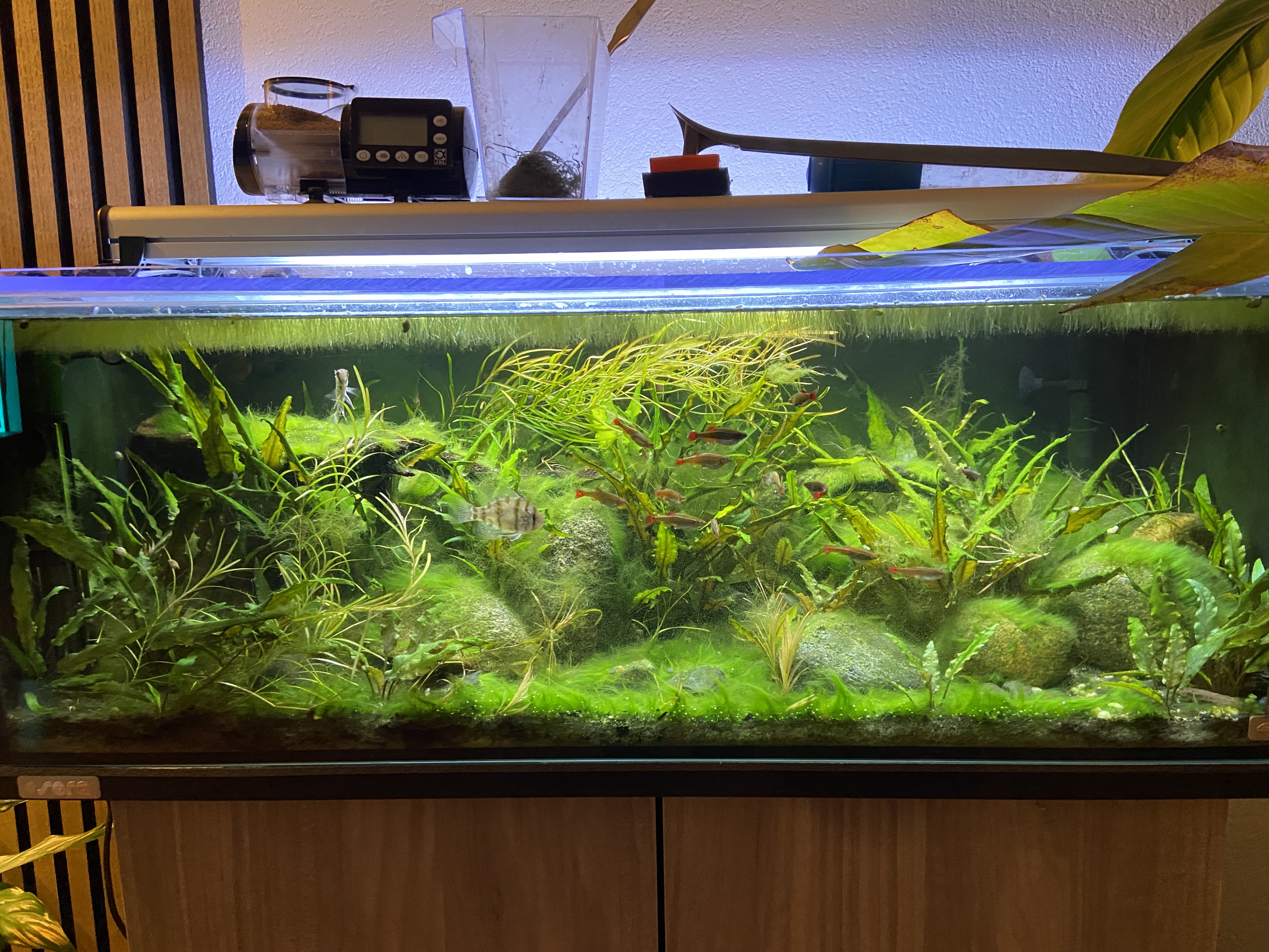 Mooie creatie met die latten en dat mos. Ook een mooie bak, kun je ook eens foto’s plaatsen van dat aquarium op de bovenste foto?