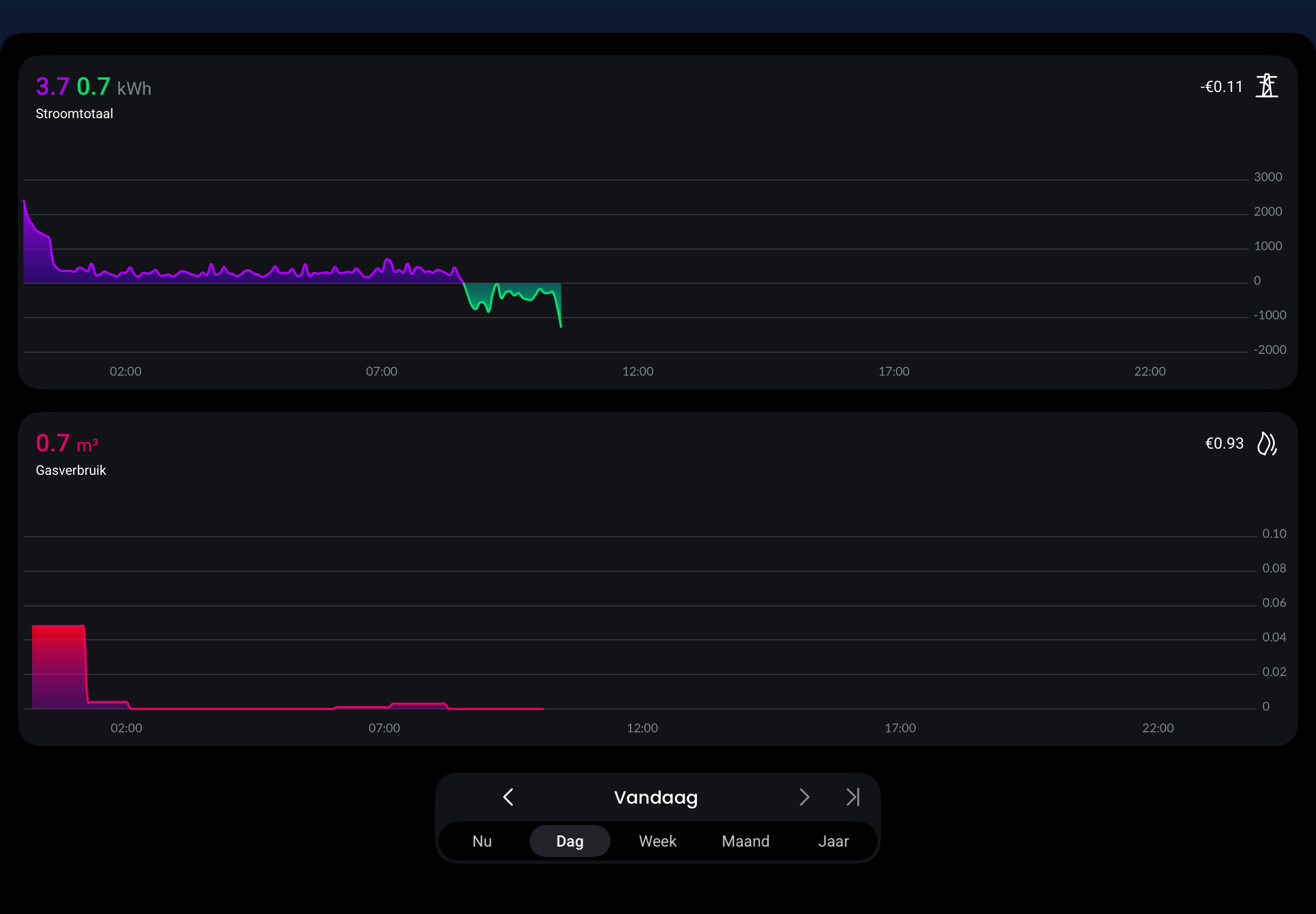 En dit is real time uitlezing via P1 meter van het verbruik/teruglevering.