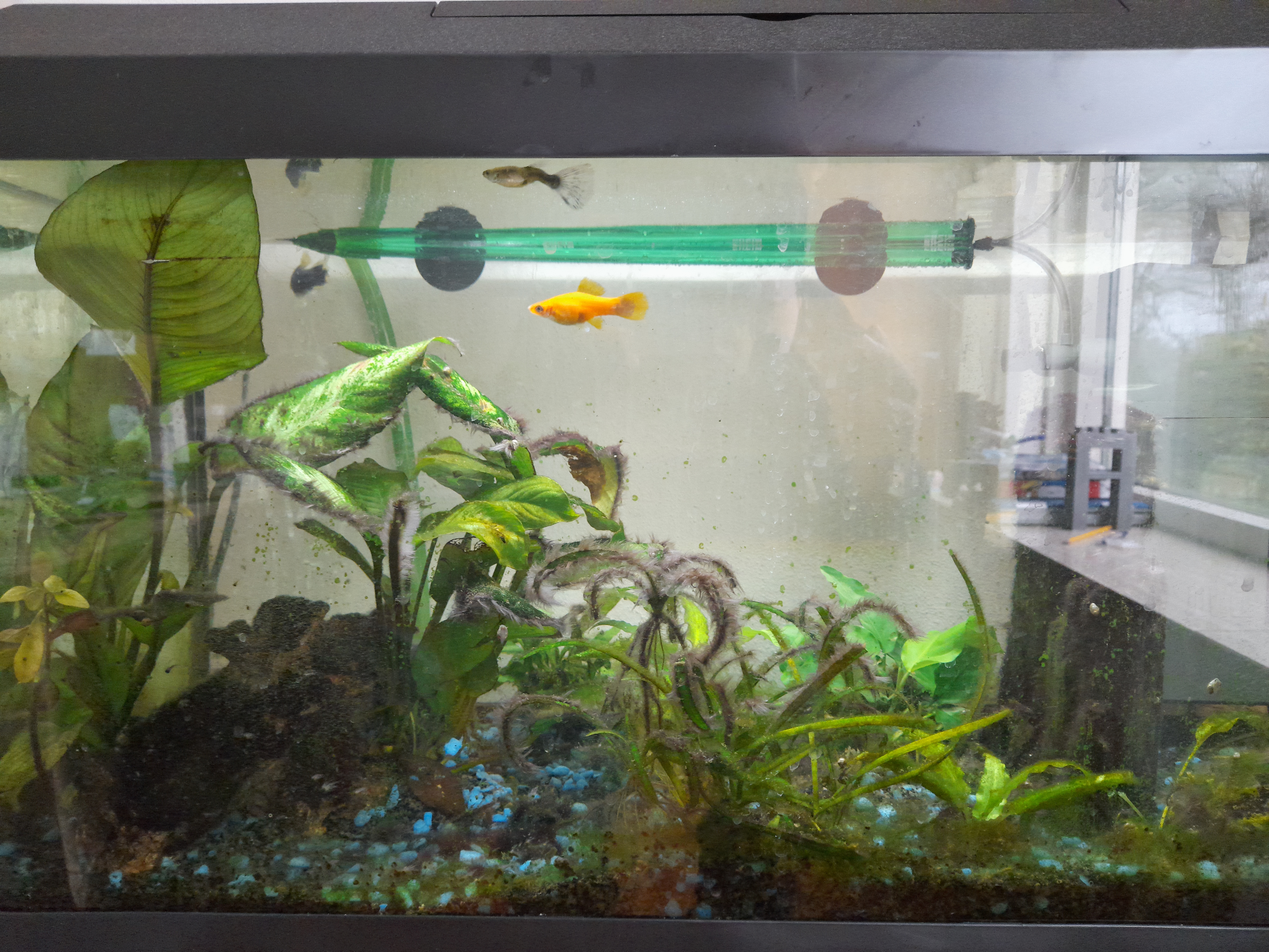 Ik weet dat de planten er niet zo goed bijstaan. Ik wil dan ook binnenkort een otocinclus kopen (in ieder geval één of twee) die lekker de groene en bruine algen weghouden. De baardalgen zou ik toch echt zelf eraf moeten halen... De baardalg kan wel een niet goede balans zijn van zuurstof en CO₂ want die kwamen best snel ineens. De groene algen niet, dat wordt elke week gewoon wat meer maar niet per se ineens heel veel ofzo.