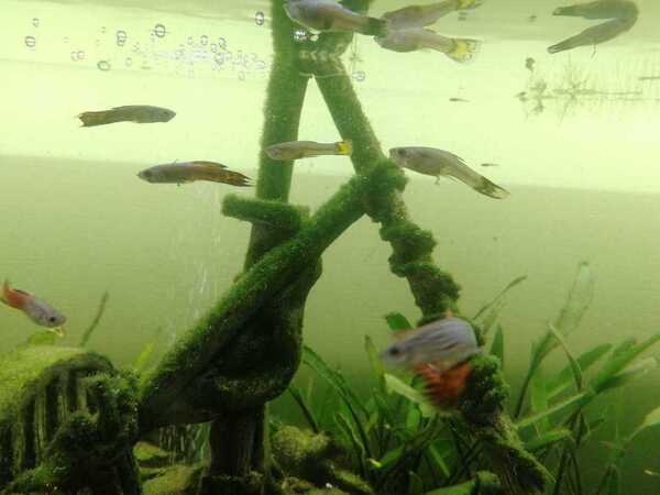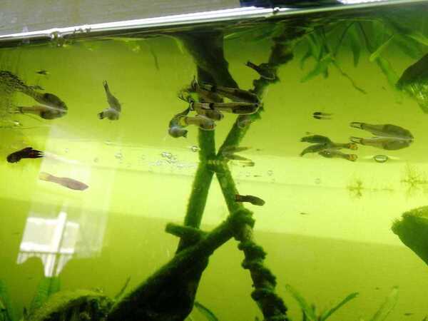 - oude guppy's actiever maar gesloten vinnen, iets beter bij sommigen maar nog steeds redelijk gesloten