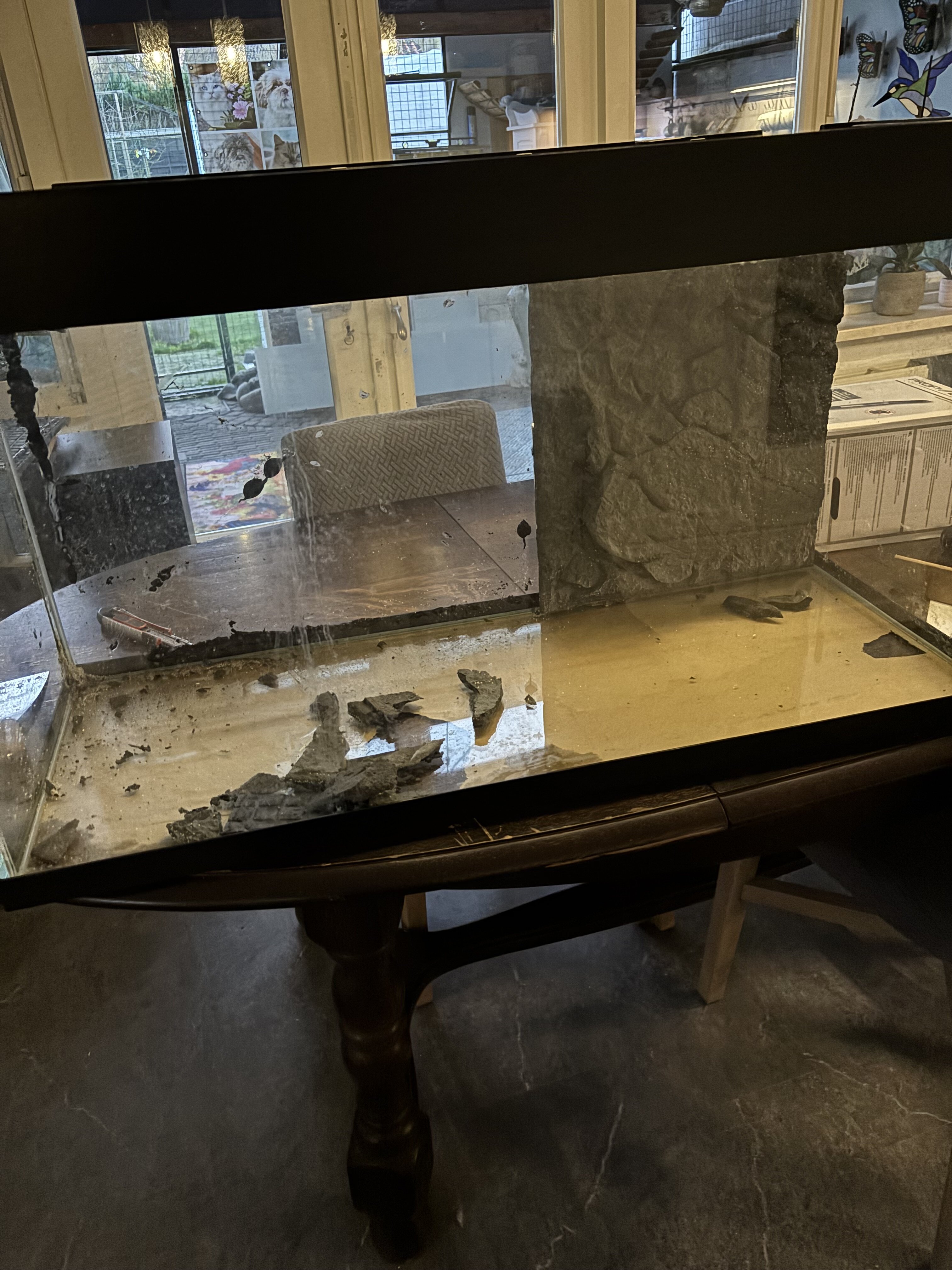 Er zit een Sera retroled in met controller, een 300 watt verwarming. De pomp heb ik niet overgenomen want die was veel te licht voor dit aquarium. Helaas zat er een achterwand in, die heb ik er meteen uitgesloopt, ik zag de ellende er al achter zitten. Wat een vieze stinktroep!