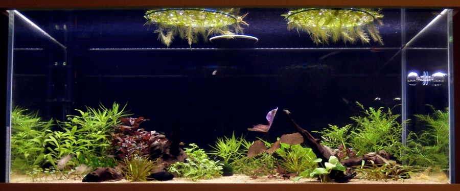 Hydrocleys nymphoides staat er ook niet meer in. Verslijmd tijdens de kuur met Bactopur Direct. Bestel ik die gelijk mee, deed het goed in de Home en bedekt al snel een deel van het oppervlak.