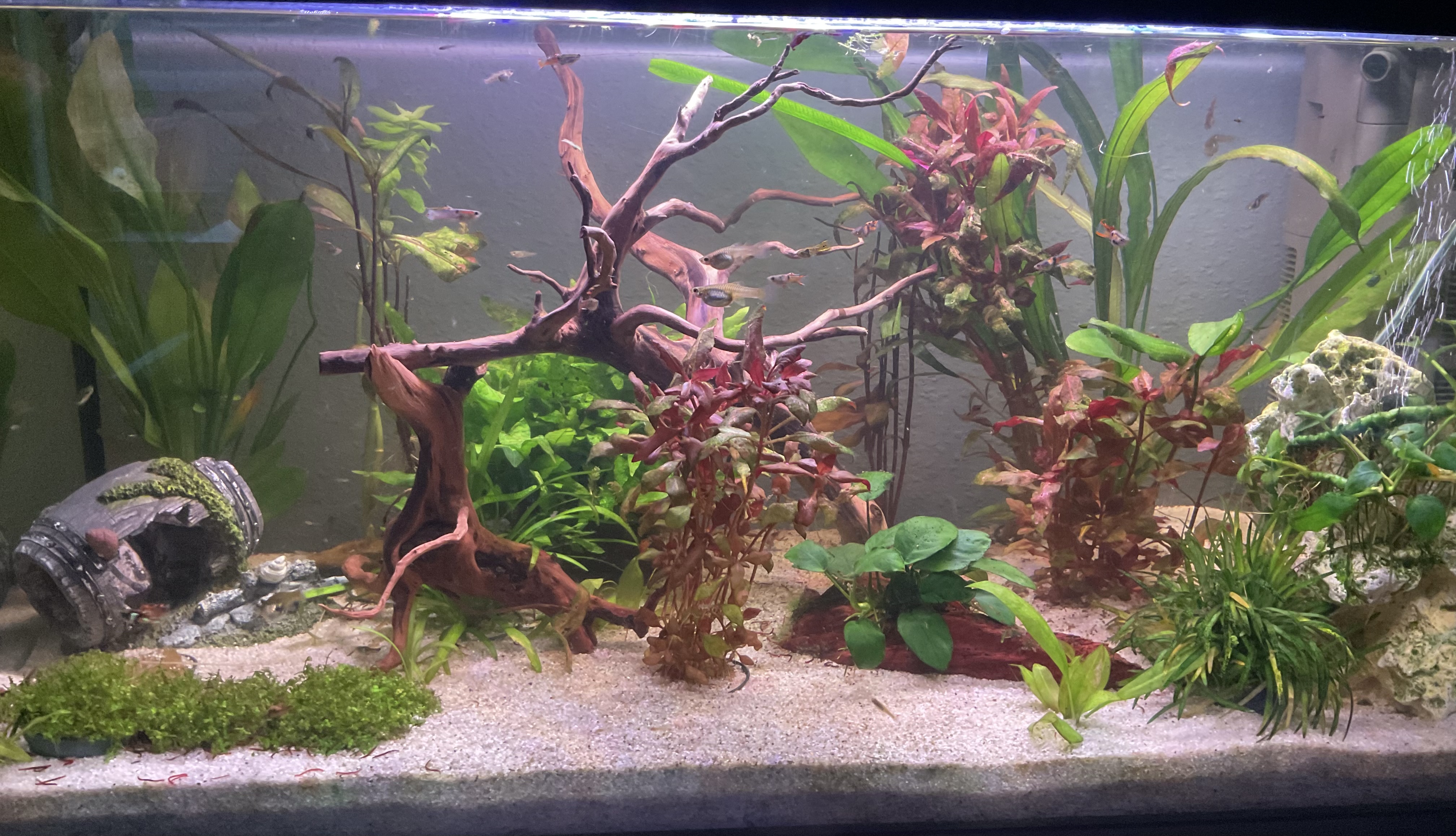 Hiervoor had ik voor 3 jaar lang een 30L aquarium met garnalen en een paar endlera guppies, daar was het dus natuurlijk makkelijk om snel iets te bedenken doordat er niet veel plek was, maar nu dat ik over een grotere aquarium beschik vind ik het vooral lastig om de plek op een slimme wijze te gebruiken zodat het niet te vol uitziet, maar nog steeds wel mooi. Enige tips (met misschien wat voorbeeldfoto’s of schetsen?) voor hoe ik mijn aquarium een mooie plek zou kunnen maken? Ideeën voor nieuwe planten ook zeer welkom, omdat ik als tip heb gekregen om andere plant-soorten uit te zoeken die makkelijker zijn in onderhoud 🙂