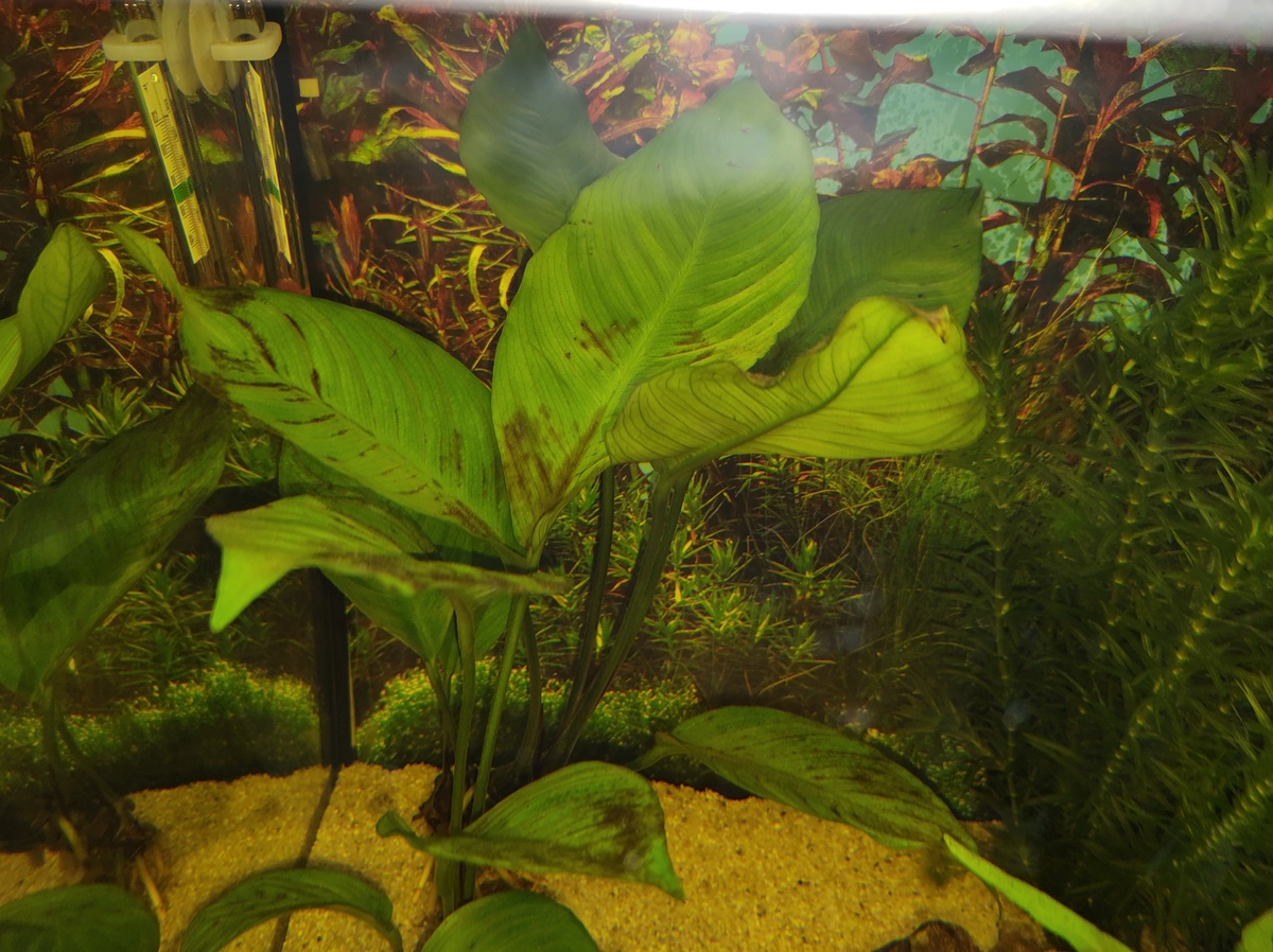 Ik maak ook elke week de bladeren weer schoon van de bruinalg en heb een algenmagneet waarmee ik al het glas schoonmaak. Ook de witte sierstenen zijn vaak helemaal bruin geworden, die ik dan of weggooi of schoonpoets in oud aquariumwater en daarna weer terugleg.