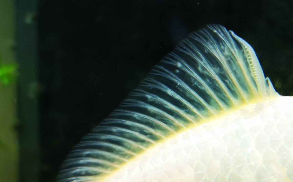 Deze verkleuringen op de rugvin zijn relatief nieuw. Omdat vis ook sinds een paar dagen zijn oog de oogkas in 'trekt' (wat er best creepy uit ziet) zit ik me af te vragen of ik iets mis (en of ik vis plezier doe om daar wat aan proberen te doen).