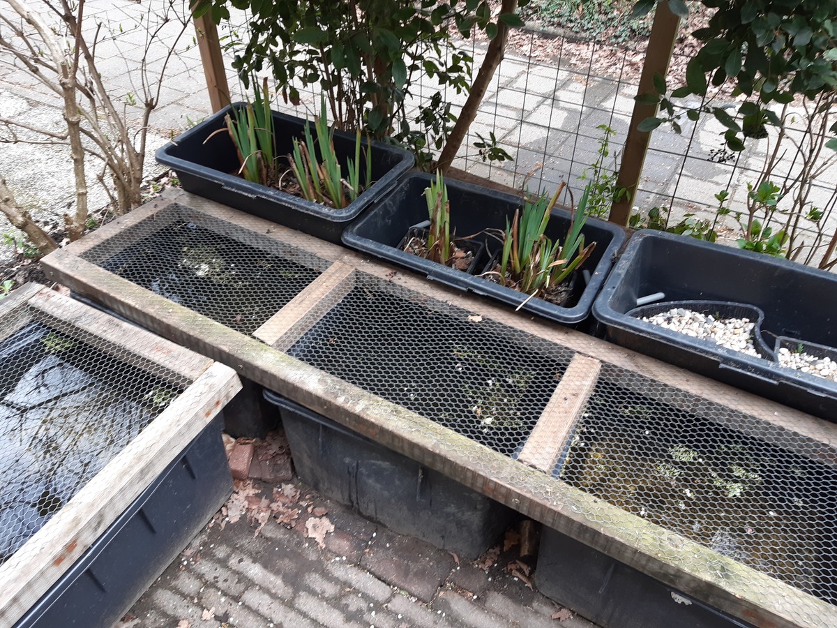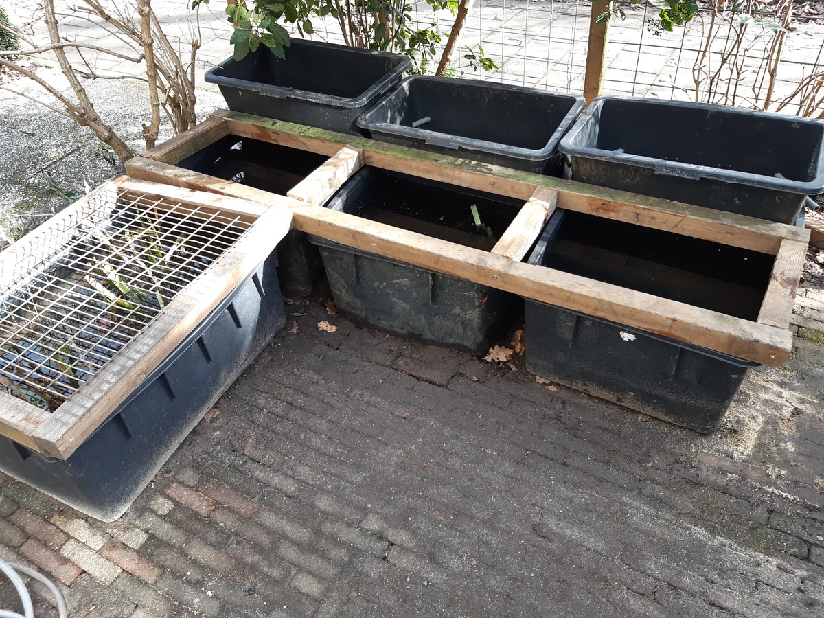 Als het mooi weer is begint het alweer te kriebelen. 2 bakken van 240 liter 10 cm ingegraven en 2 van 180 liter bovengronds geplaatst. Bij 3 bakken bakken erboven geplaatst voor gele lis en aronskelk. Over het hout nog gaas voor tegen de nieuwsgierige katten.Nog een paar weken wachten en dan planten poten en daarna langzaam vissen overzetten.
