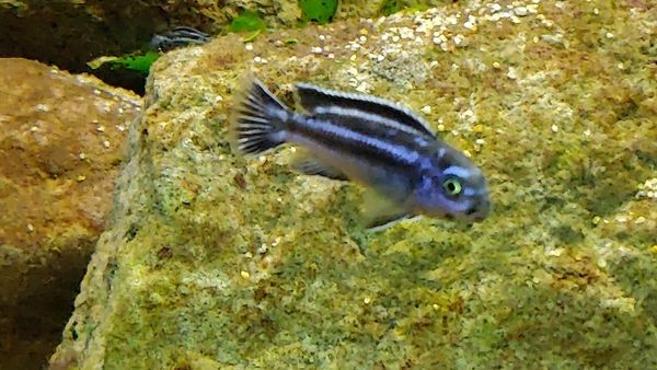 Eén van de nieuwe Maingano's (zo noem ik ze ook maar gezien het lastige cyaneorhabdos). Opvallende verschijning in de bak en de jonge dieren zijn al prachtig op kleur.