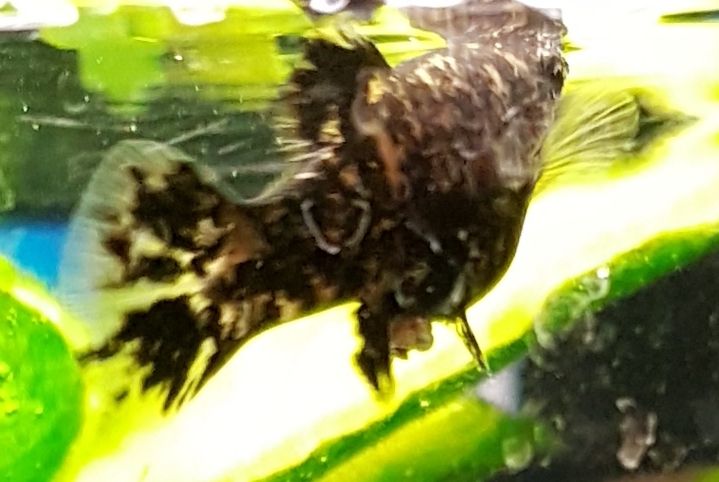 Ik heb mijn uiterste best gedaan foto's te maken, helaas wil mijn telefoon niet zo goed bij snelle beweging, en het is een actief visje. Ik hoop dat het te zien is en dat iemand misschien weet wat er met haar aan de hand is.
