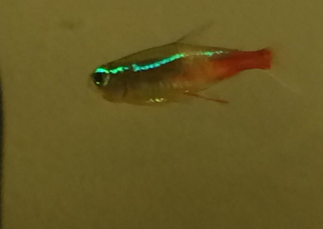 Mijn neon tetra heeft een roze streep. Eerst was het streepje nog klein zo groot als de onderste vin maar nu ik wat later keek was het sliertje veel langer geworden zie foto. Ik heb een bak van 60x30x30