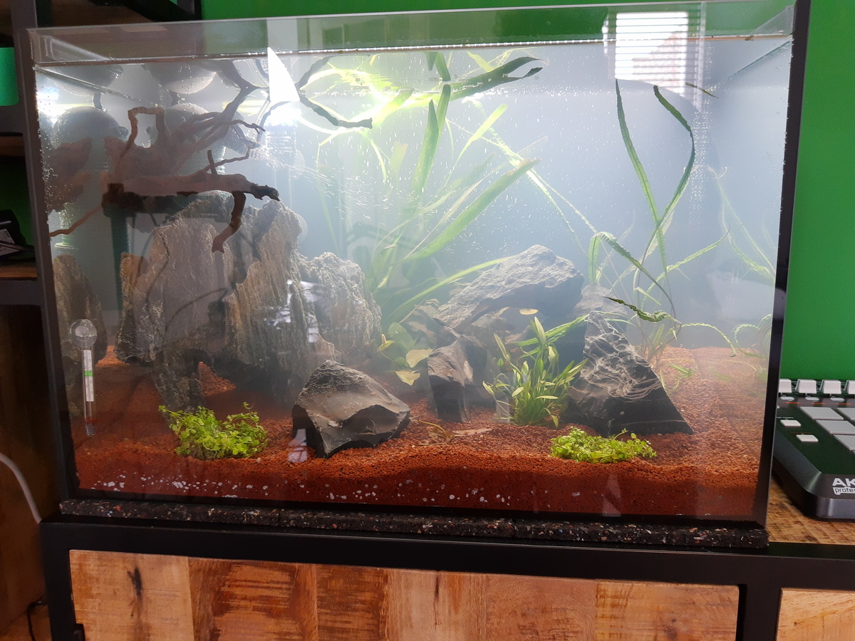 Sinds dit weekend een trotse eigenaar van mijn eerste aquarium. Nadat ik de bak schoongemaakt heb met lauw water en het grind erin gelegd heb ben ik begonnen met de planten te plaatsen.