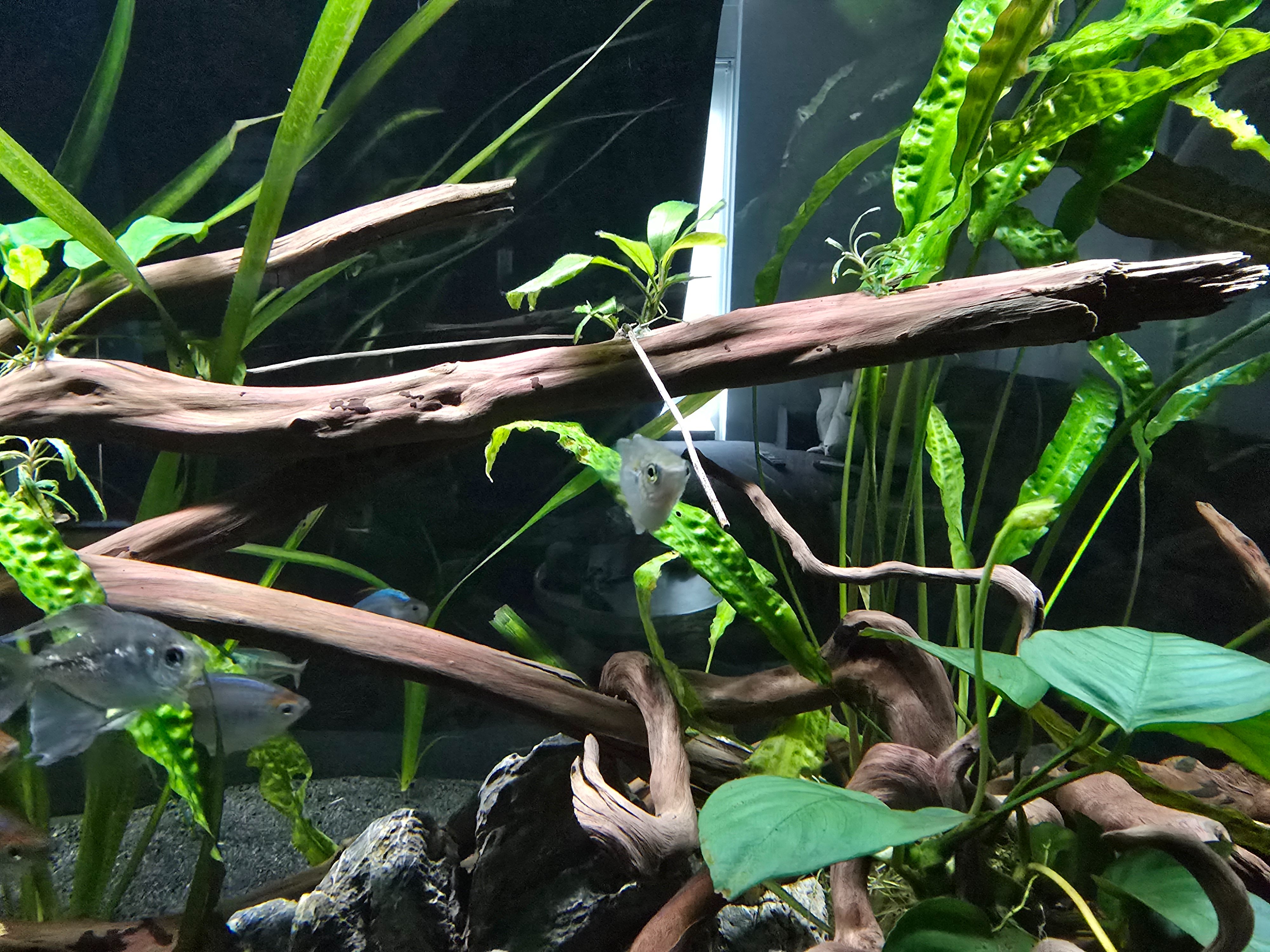 Ik wil op de takken links en rechts nog wat plantjes plakken, ws wat bucephalandra, en heb nog een paar types regenboogvis die ik erbij wil op ten duur, maar voor nu draait alles lekker 🙂