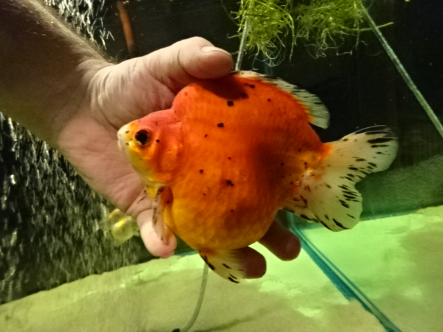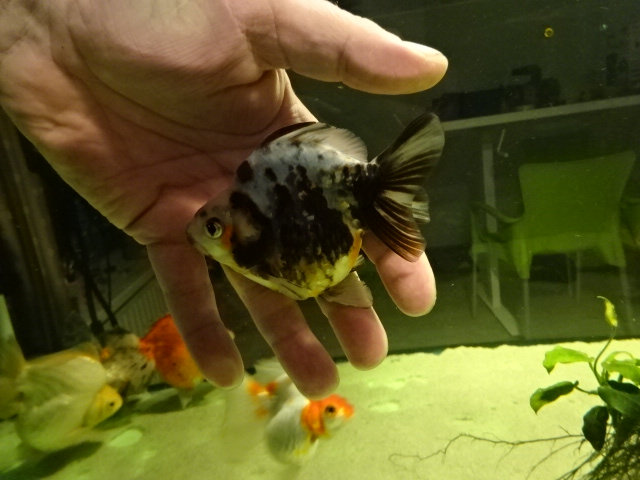 Vanavond zal ze aan de overige clubleden voorgesteld worden door een plechtige doop in de grote plas. Voor alsnog moet ze even in een Argulol badje verblijven om eventuele Ankerwormjes te bestrijden. Die wil ik niet ter overname introduceren.