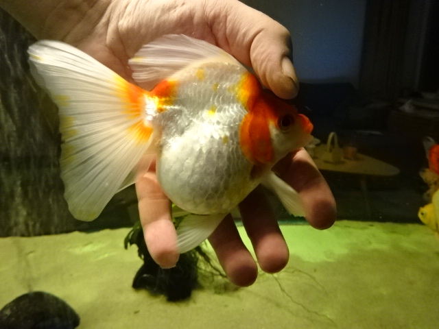 Calico blijft een beetje achter in de groei zie ik maar is verder wel gezond. Denk dat Red Calico zonder vinnen ongeveer 10cm hoog is nu. Hoeft niet veel groter voor mijn 530L bak hoor ben erg tevreden.