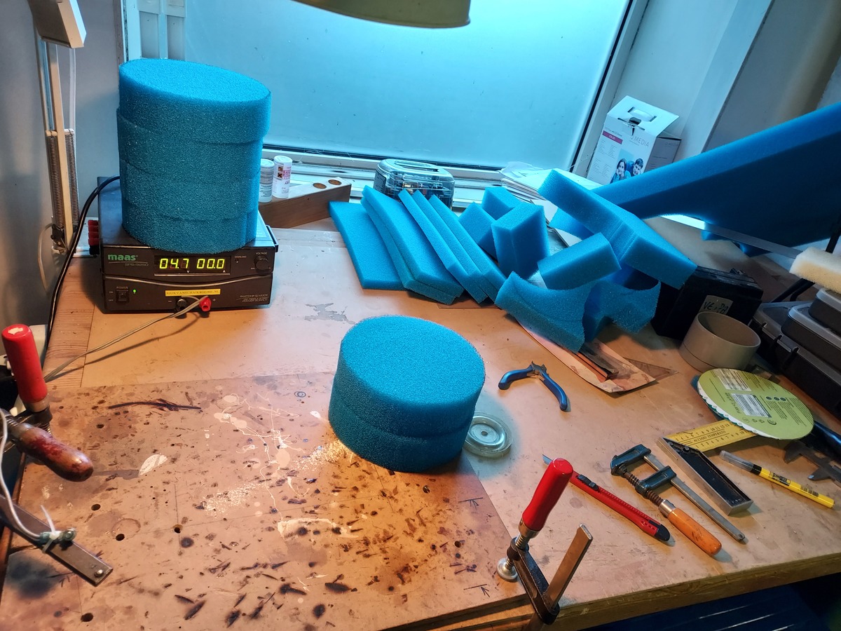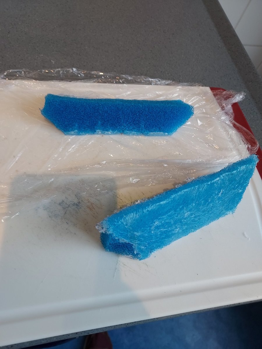 Redelijk goed gelukt zo uit de hand en beslist functioneel echter is dit 2x5cm en de mand is 9cm diep. Dat is dus samen 3cm te veel. Bovenop, onder de deksel is nog ruimte en tussen de mandjes is even afwachten of dit past want onder de mandjes zit ook een rand voor de binnenmandjes op elkaar te laten passen wellicht past die cm daar nog in anders weer een laagje eraf snijden. Het afval zou ook nog onder de mandjes passen voor de pompinlaat, of wellicht meer schuim daar onderin. Heb ook nog JBL kogels in gebruik die ook onderin de buitenste rand kan dumpen. Bij onderhoud zouden die kogels dan ook niet richting pomp kunnen rollen als de mandjes er uit zijn en het midden opgevuld met schuim.