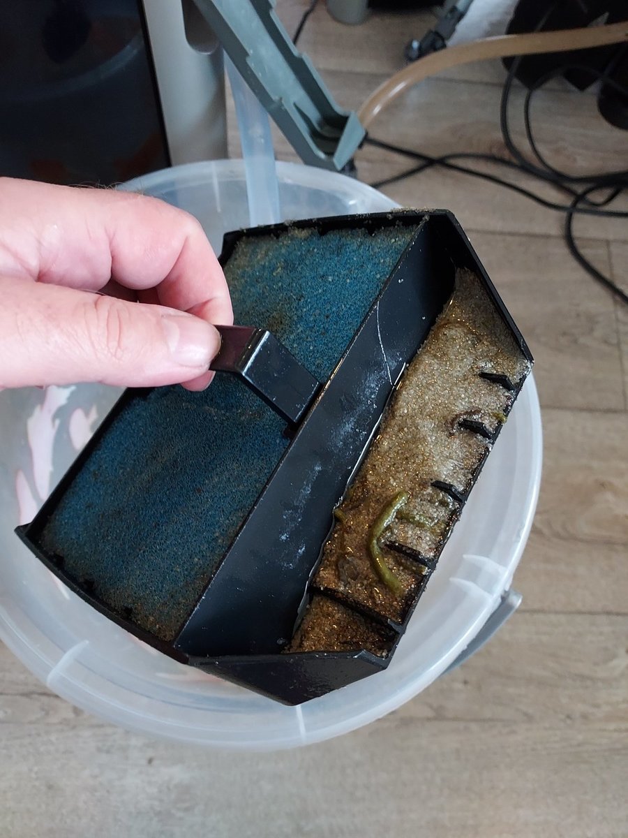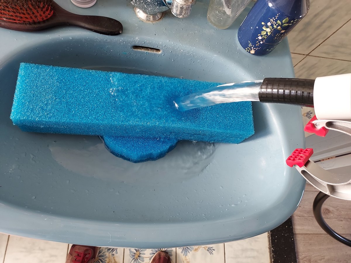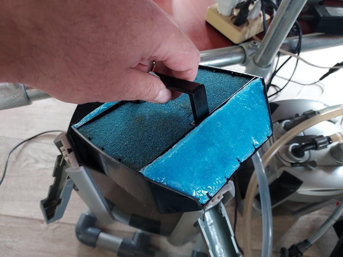 Stukken schuim zet ik er pas in met een waterwissel maar ga het water in mijn badkuip storten en zet daar de mediamanden in dan kan ik wat rustiger werken.