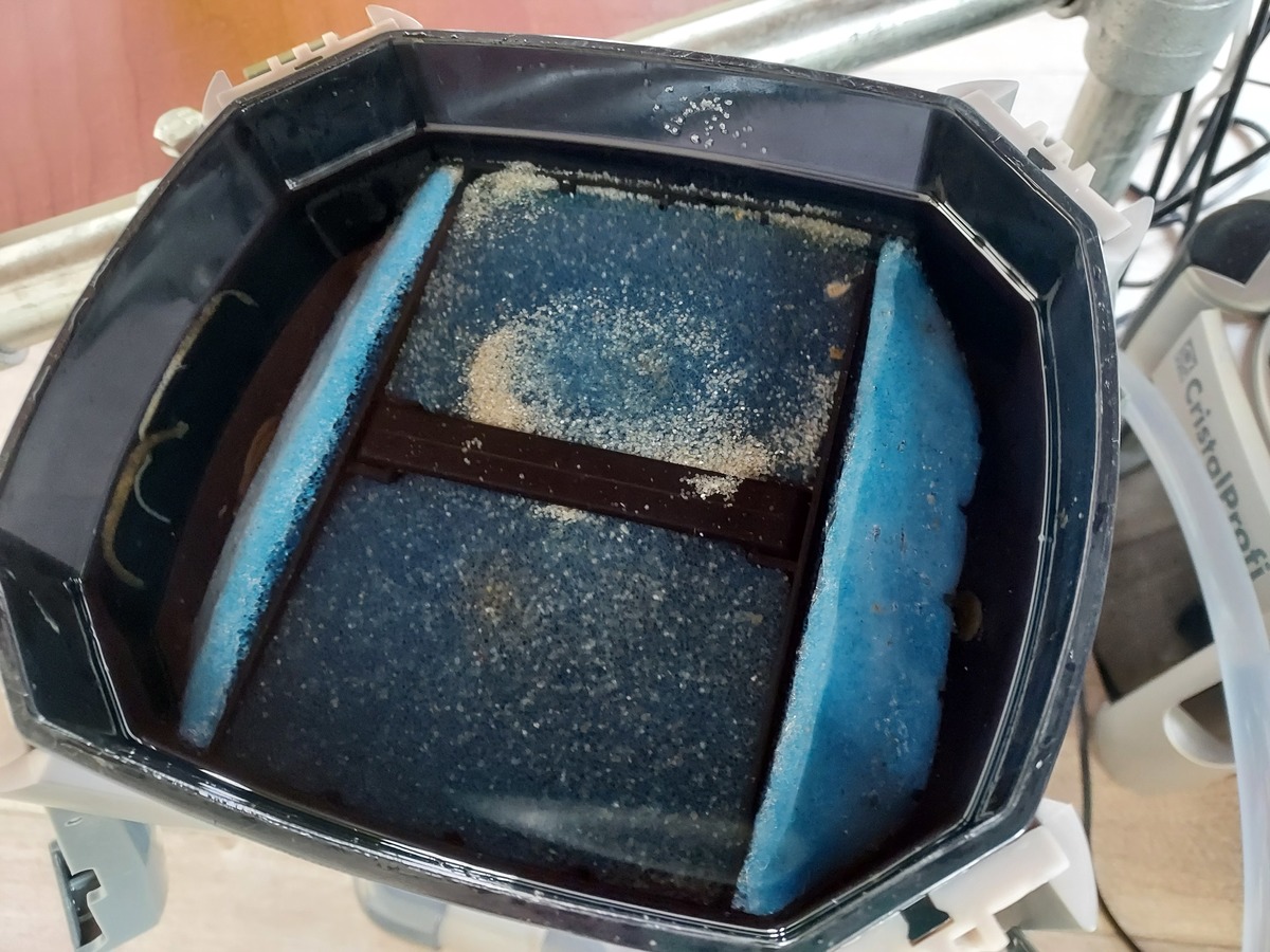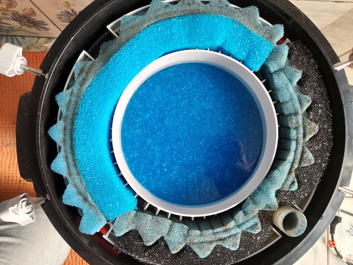 Ik denk hierbij eerst de onderste bak OF helemaal in een filtersok te steken OF het medium schuim wat er in zit om het met name het zand tegen te houden om in het schuim te trekken.
