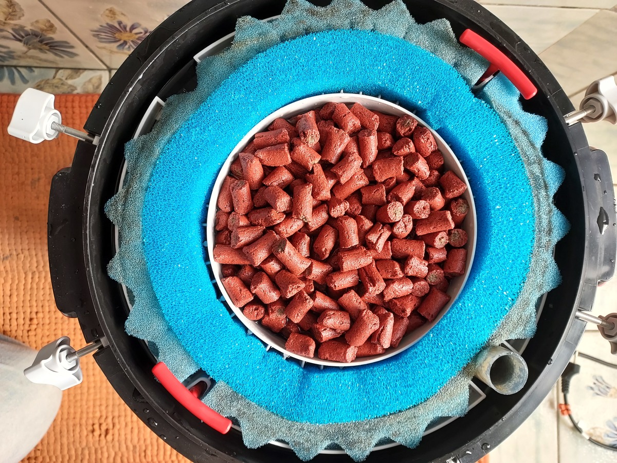 Nu heb ik de Biohome Ultimate in mijn FX6 doormidden gebroken om het midden van de pot nog beter te kunnen vullen met media dus het water zou meer weerstand moeten hebben om langs de media te moeten stromen en zou mijn debiet af moeten nemen wat voor mijn sluiers ook de bedoeling was... En die opzet is dus niet gelukt omdat de biohome zelf ook voor een groot deel een zeef is. En na bijna een jaar is die media nog niet eens aangekoekt maar gewoon schoon dus zal die ook niet gaan verstoppen.