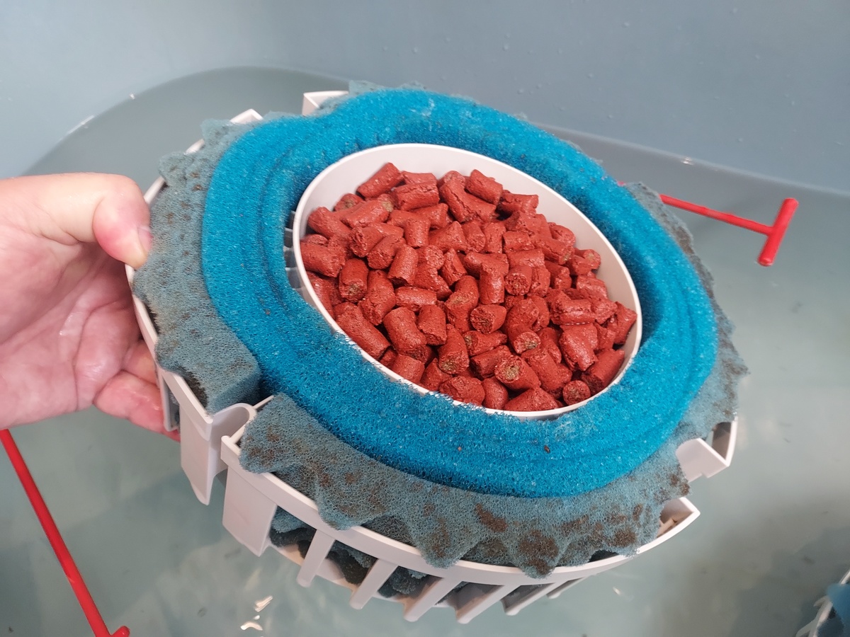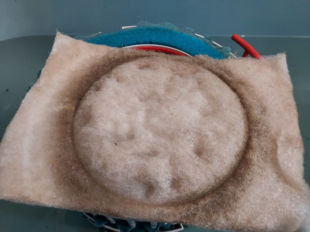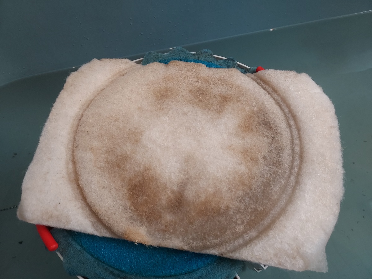 Was wel aangenaam verrast dat de filterpad die ik een paar weken eerder over de mandjes gelegd heb (ipv alleen over de media) aan de onderkant goed filtert boven de buitenring en nogmaals in het midden.