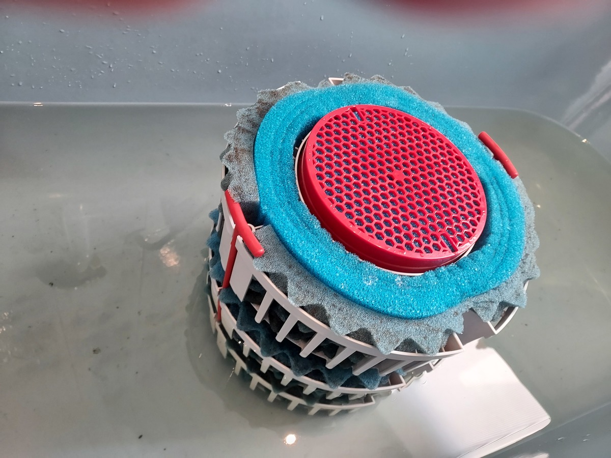 Onderin bij de pompaanzuiging nog noppenschuim op maat geknipt en op het bovenste mandje het rode bakje op zijn kop met schuim er in. Dit omdat als het filterpad bovenop verdikt als die verzadigd raakt en het schuim naar beneden drukt. Het bakje houdt dit tegen. De noppenschuim bovenop drukt de pad aan tegen de mandjes als de deksel dichtgeschroefd wordt.