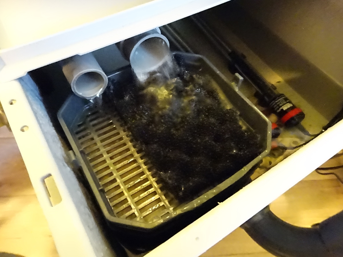 Wil ooit nog eens de onderste bak waar de pomp en media zit van elkaar te scheiden. Als de instroom net te laag is kan de media droog komen te staan. Pomp draait nu op 38W=3000L/h dus best netjes nog.