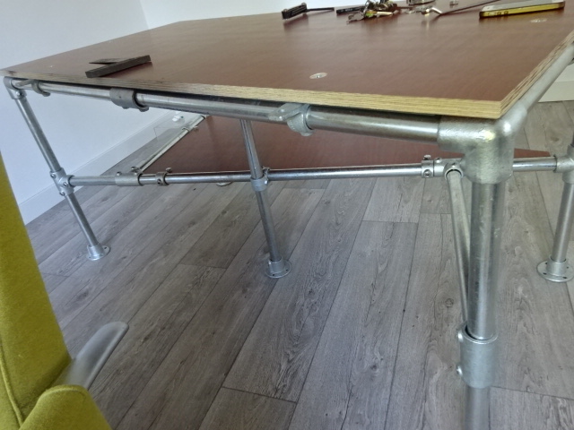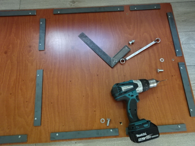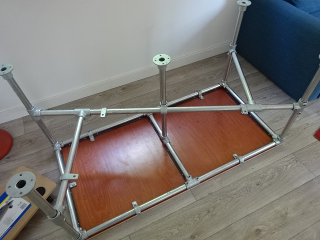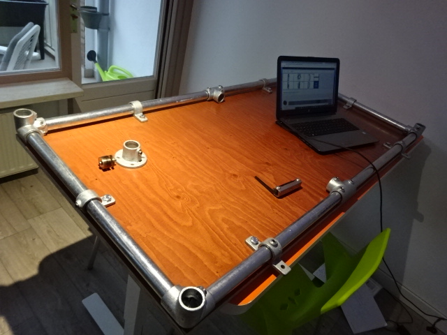 Zondag 18mm betonplex laten zagen en gisteren potgaten geboord voor inslagmoeren. NU zijn de montageflenzen op het blad gebout en kan ik de buizen en koppelingen goed uitlijnen. Wel jammer dat de maatvoering zeer los is en onnauwkeurig dus moeten er vulstrippen tussen buis en blad komen om de vlakheid te garanderen en de druk te verdelen.