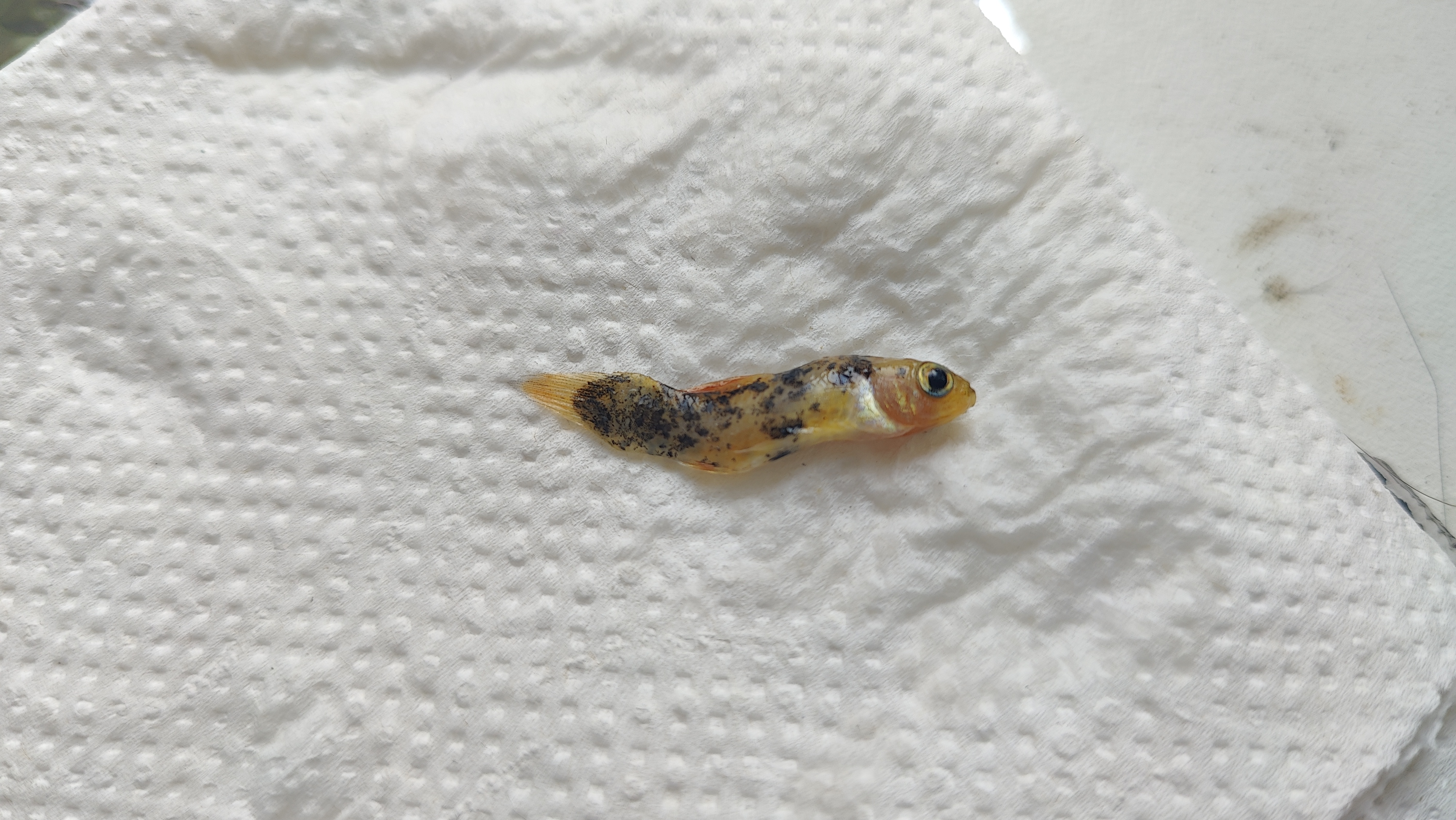 Ik heb er nu nog maar 2, nadat ik zojuist eentje heb ge-euthanaseerd met Kruidnagelolie (zie foto dood en foto levend). Deze was altijd al slank, maar zn buikje werd steeds holler ipv boller en hij werd bleker en hing meer op de bodem en verstopte zich. Deze was wel even groot als zijn -nu nog gezond ogende sibling, ong 2,5-3 cm. Enkele dagen geleden heb ik een veel kleinere Platy (ong 1cm.lang (echt een te groot verschil gezien ze allemaal al een jaar oud zijn) die ook een plat buikje had, al dood gevonden op de bodem.