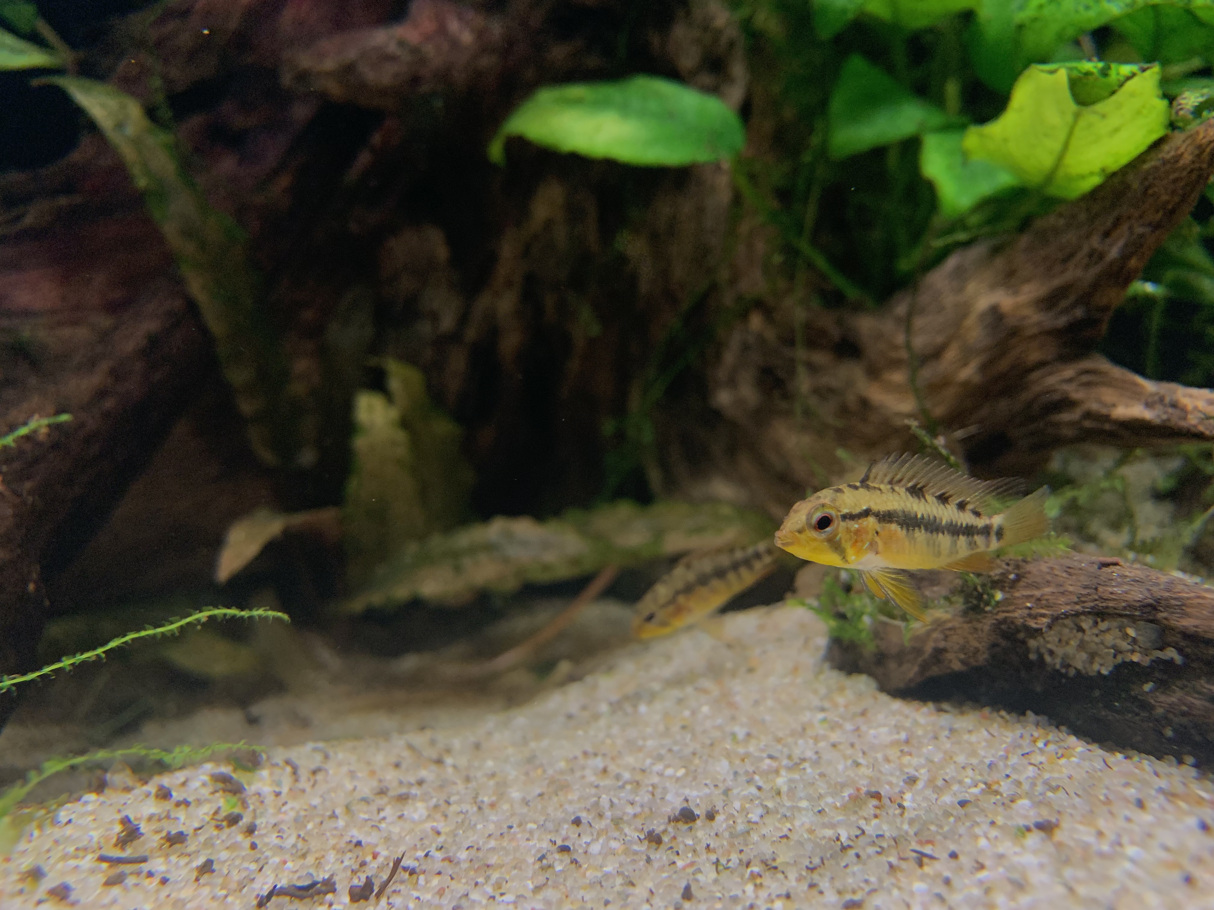 Pelvachromis soortje (geen kersenbuik), Apistogramma soortje (waarschijnlijk macmasteri), Schaakbordcichlide, microgeophagus ramirezi of Nanochromis transvestitus.