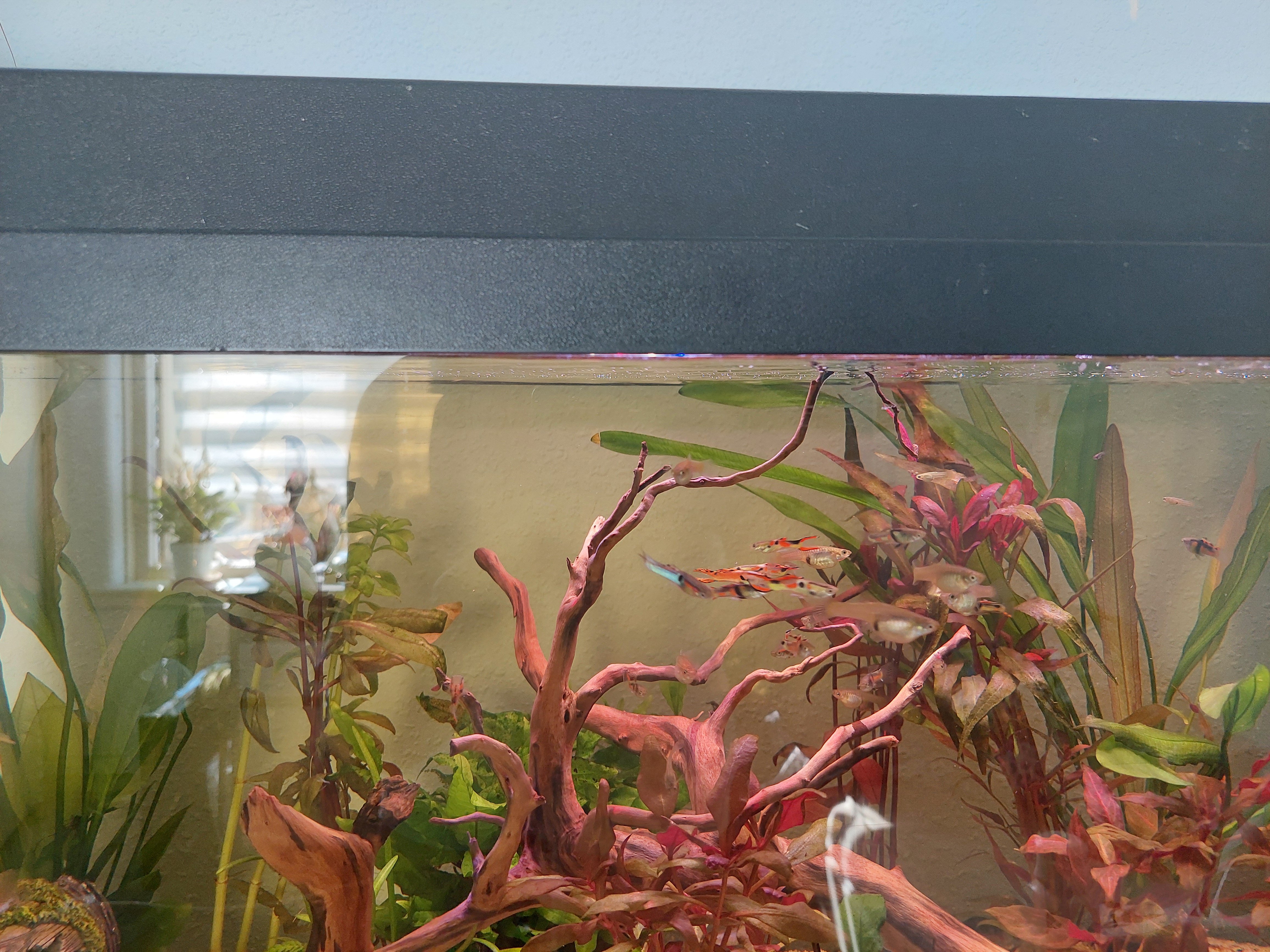 - ik heb onder anderen: 2 regenbooghaaien, 1 L144 pleco, een schooltje endlera guppies, 2 antennebaarsjes (die beide ook schimmel stipjes hebben, de verkoper had aan mij verteld dat dit normaal is bij dit soort en dat dit niet de rest van de vissen zal aanraken, toch behandel ik de water elke 2 weken met de anti schimmel en wittestip medicijn, dit lijkt niet te helpen voor de baarsjes, maar de andere vissen hebben tot nu toe nog steeds geen verschijnselen van), 3 (nu maar twee nog) corydora’s en een paar cherry garnaaltjes.