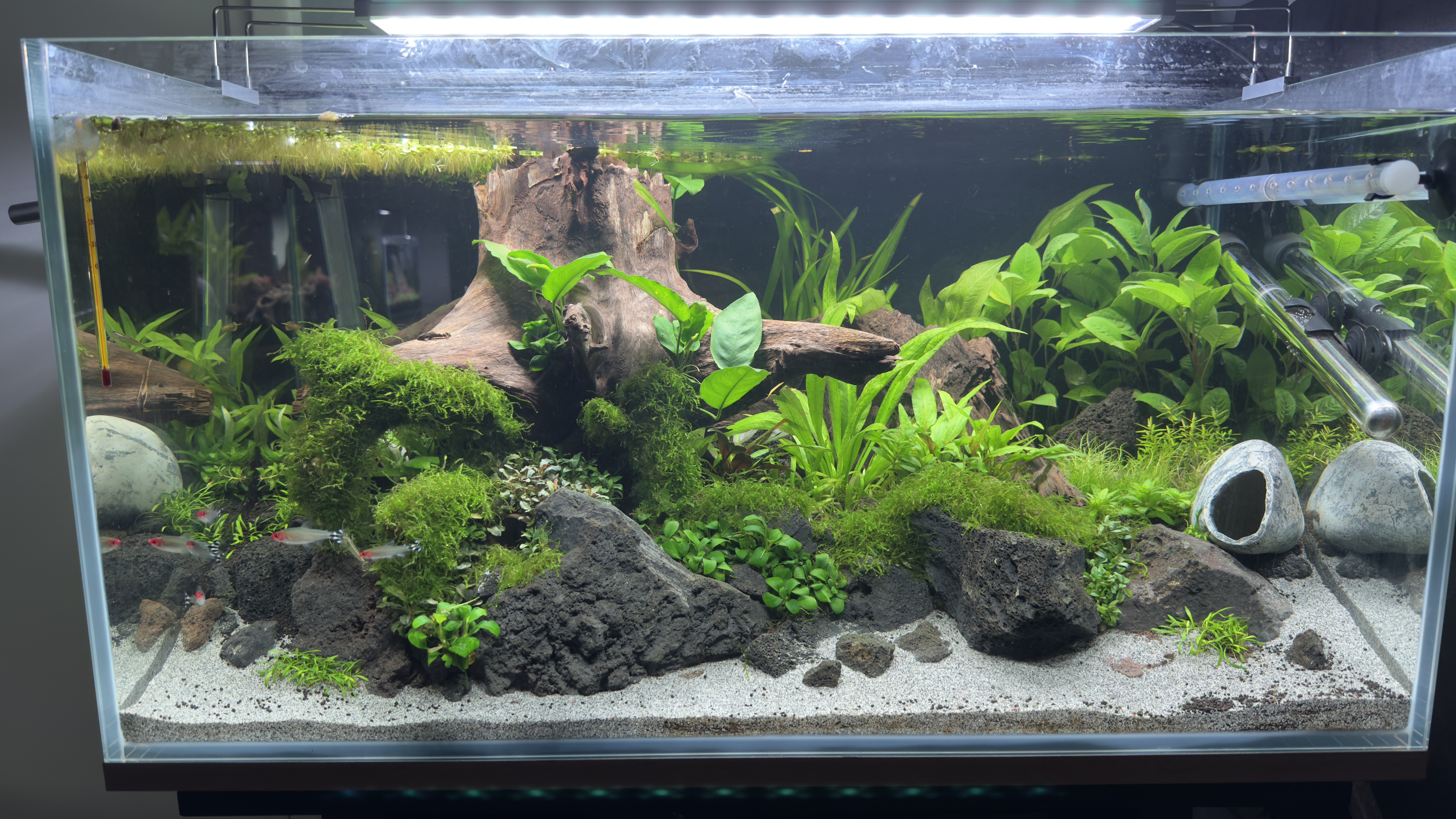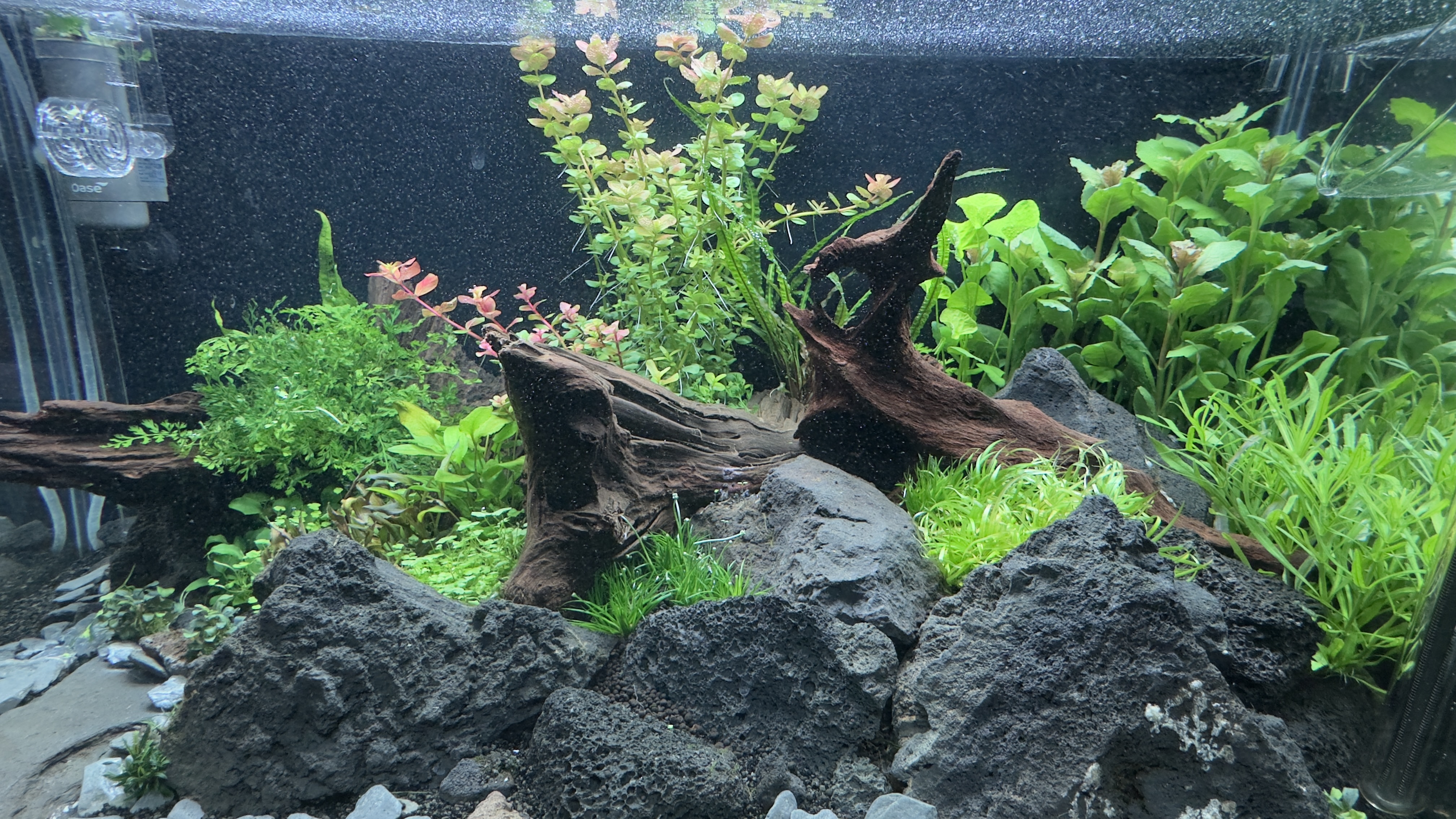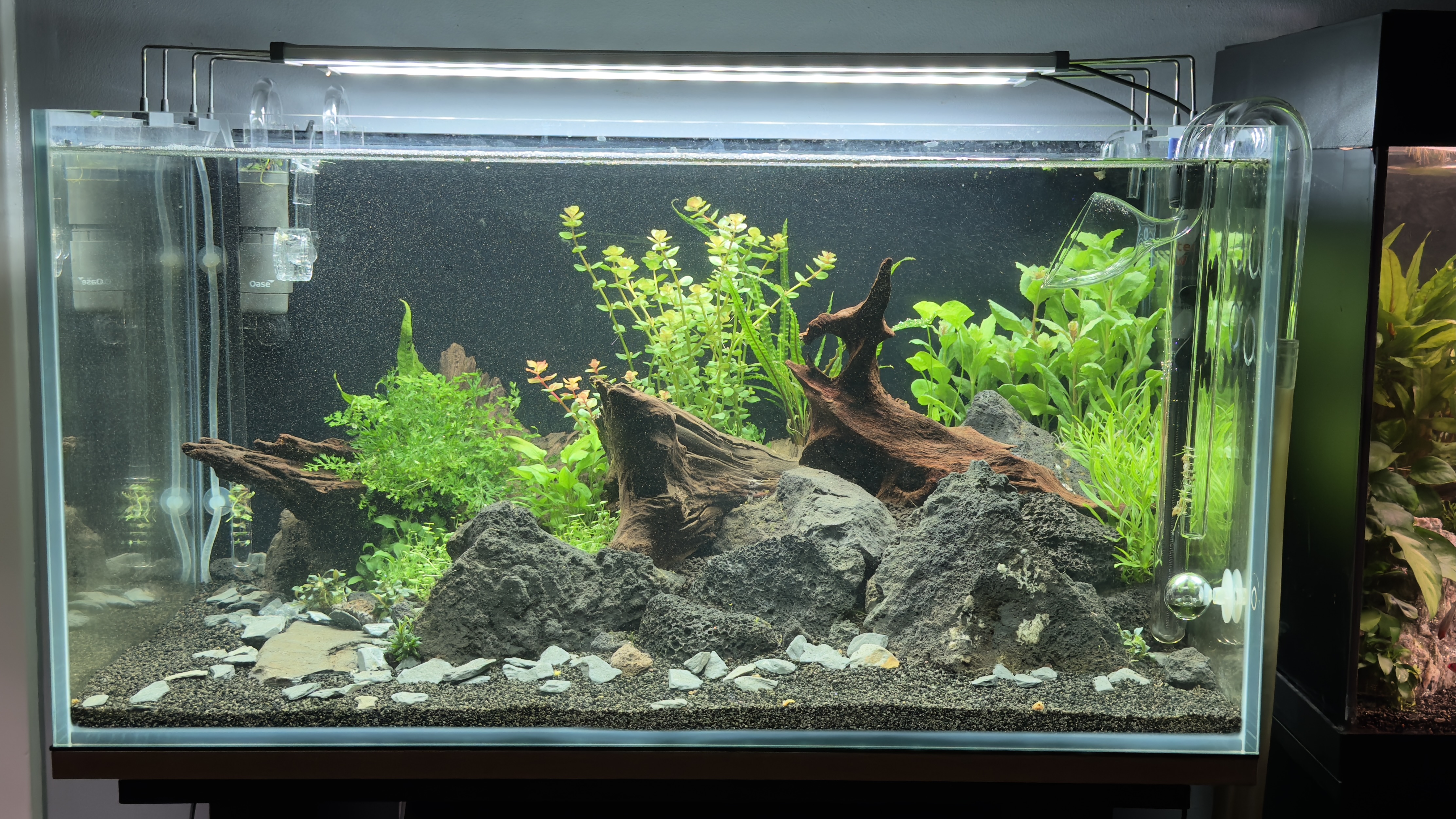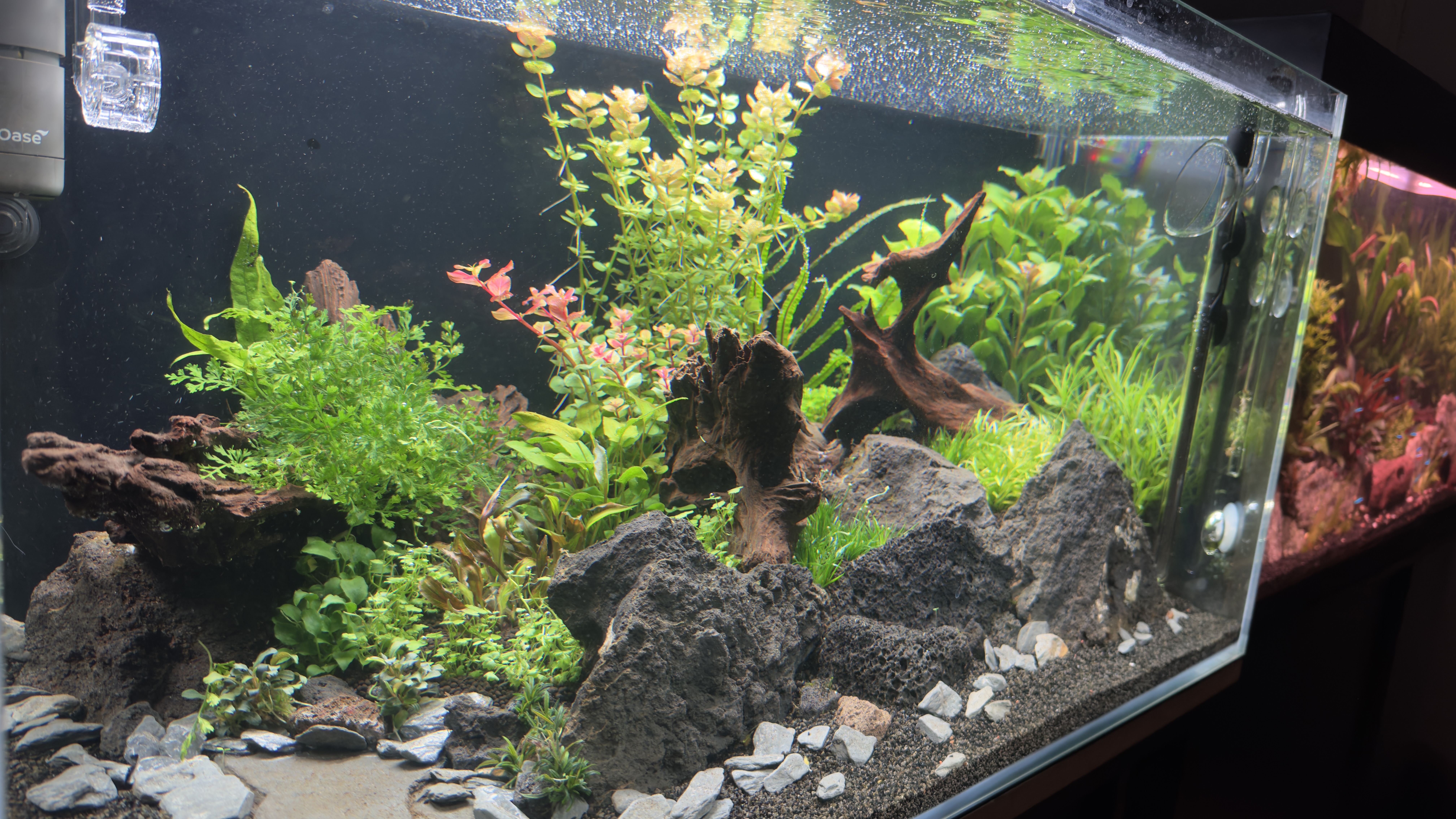 Het is een low tech setup met SuperFish Scaper 140 (138L). Filter is een Tetra EX1000 plus en de lamp een Chihiros B601.