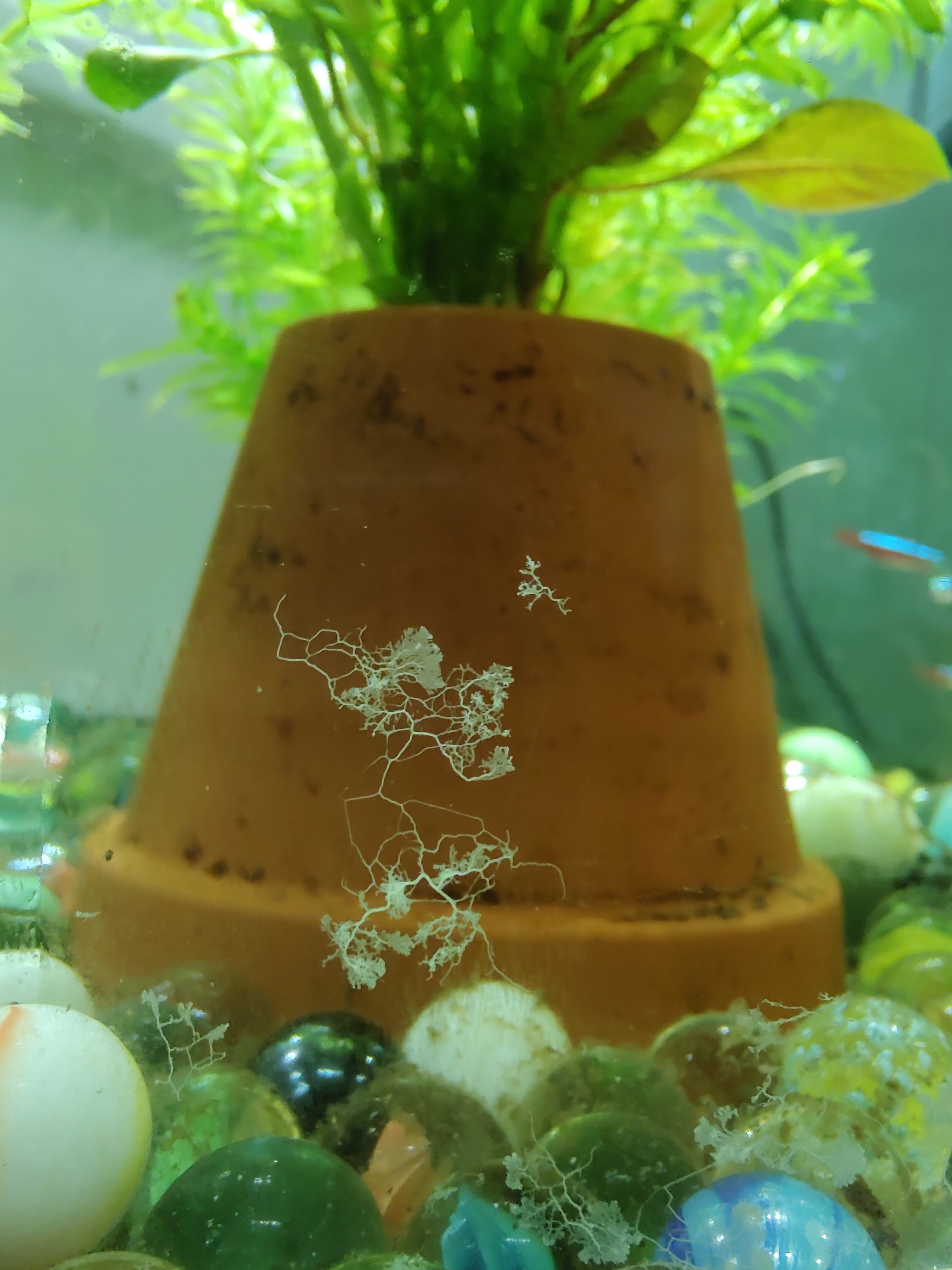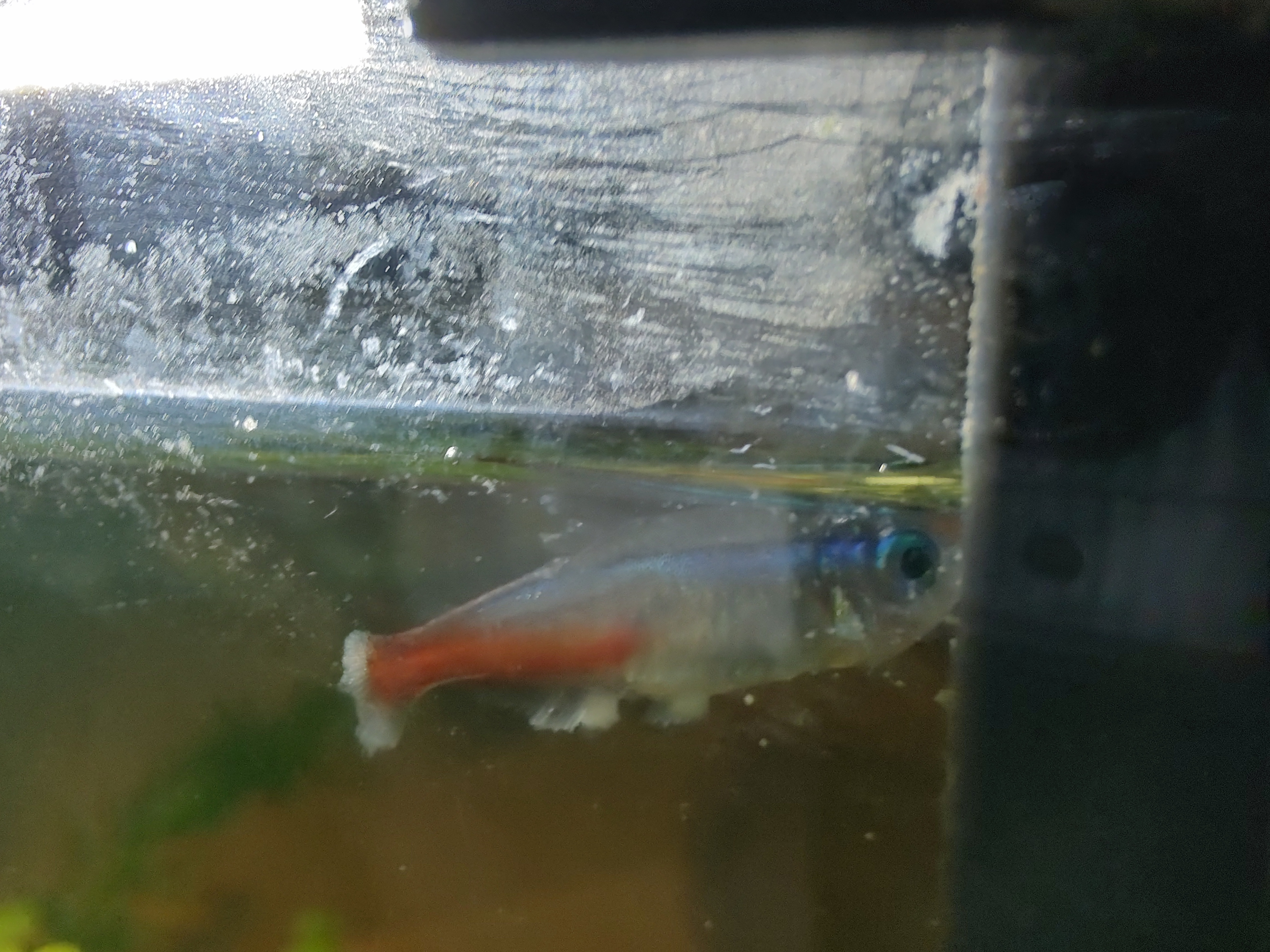 Nu zit er een schimmel (slijmzwam?) In het aquarium en zijn we in twee dagen al vier Tetra's verloren, deze dreven dan plots boven in het aquarium. Één tetra is nu bijna zijn volledige staart kwijt en kan haast niet meer zwemmen?