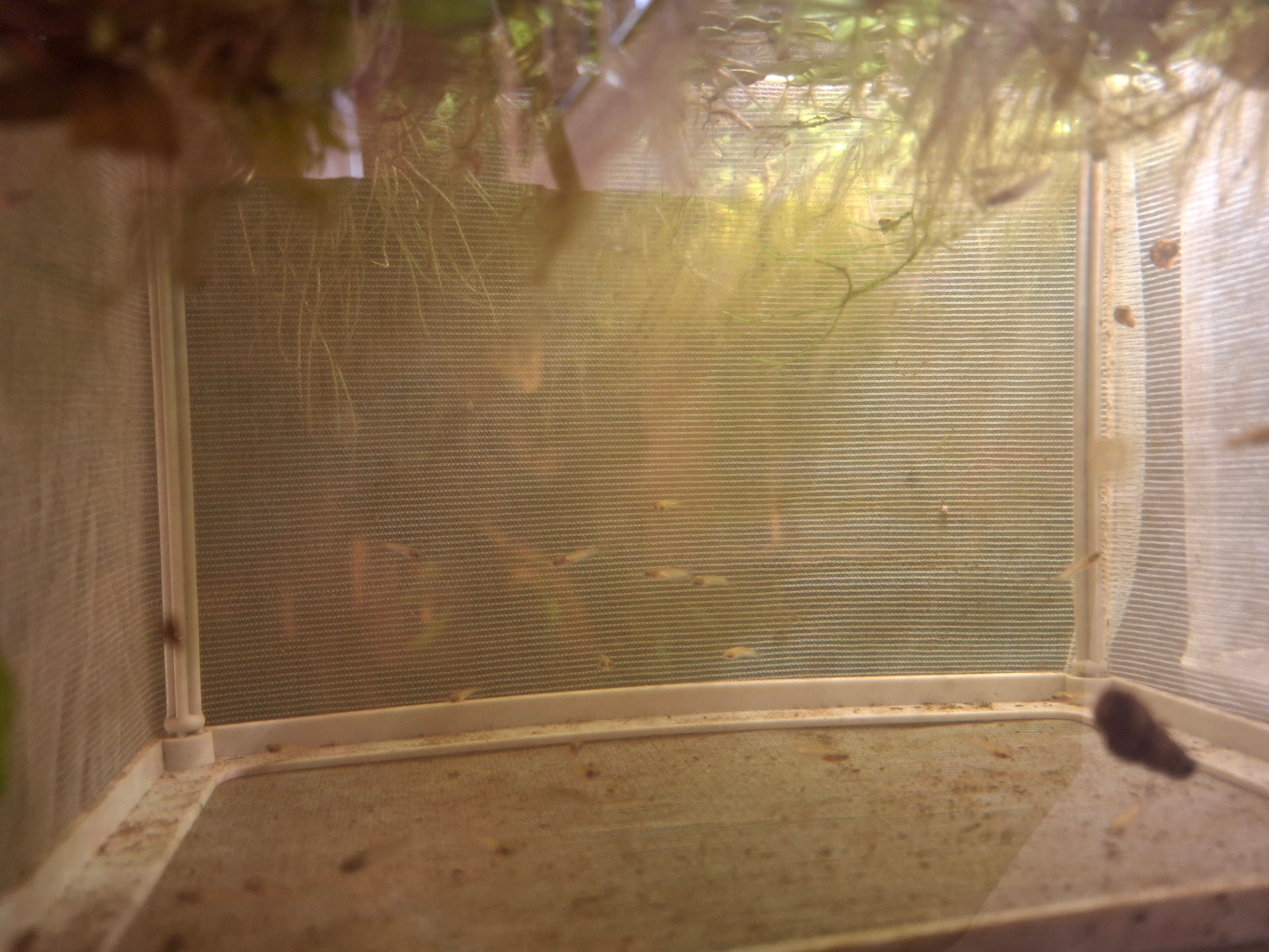 Kweeknetje onder het netje schuiven. Zie bijgevoegd een foto van onze opstelling; deze met ~25 jongen Betta Channoides. Dit geeft waarschijnlijk de beste kans op overleven. Schuif dit ding er zo snel mogelijk onder.