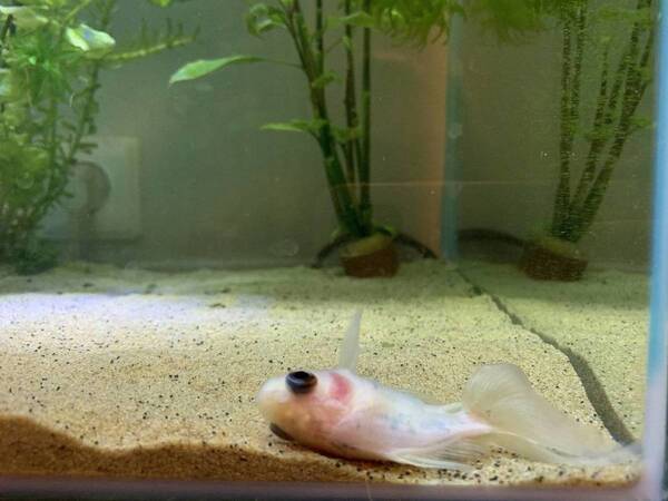 Foto zieke vis, foto taalt aquarium zodat we mee kunnen kijken.
