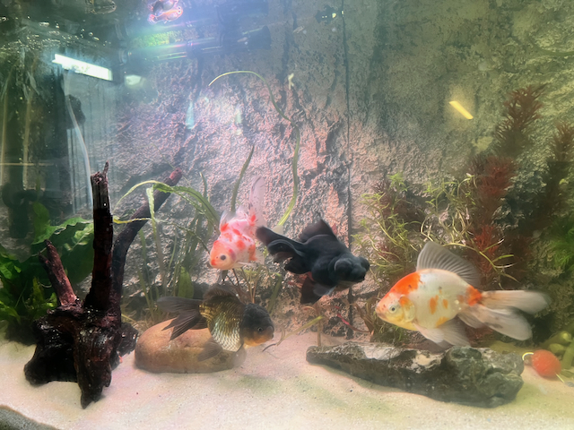 Met tussenpozen heb ik nu speciaal voor de vier sluierstaarten een 250 liter aquarium ingericht. Het probleem dat ik in de kleinere bakken al had blijft terugkomen, namelijk dat één van de sluierstaarten bijna permanent achtervolgd en getreiterd wordt. Het betreft de vis linksboven. De "pestkop" is de vis rechtsonder en in mindere mate de zwarte in het midden. De vis linksonder (samen als klein visje gekocht met vis linksboven) blijft buiten schot. Voorheen deed ik de dader of slachtoffer wel eens een dag in een aparte bak en dat hielp even, maar dat is nu niet meer mogelijk. Het zal vast met mannetje/vrouwtje te maken hebben naar mijn idee.