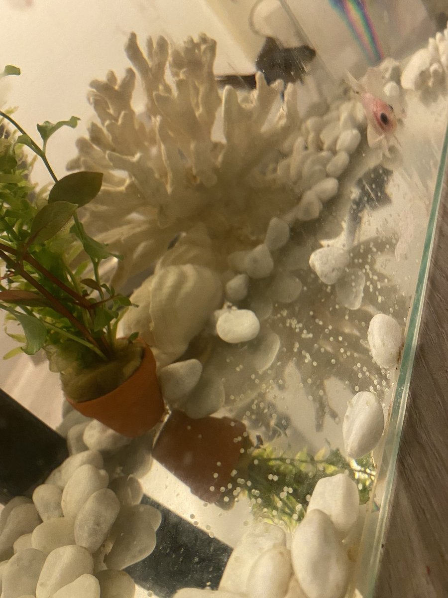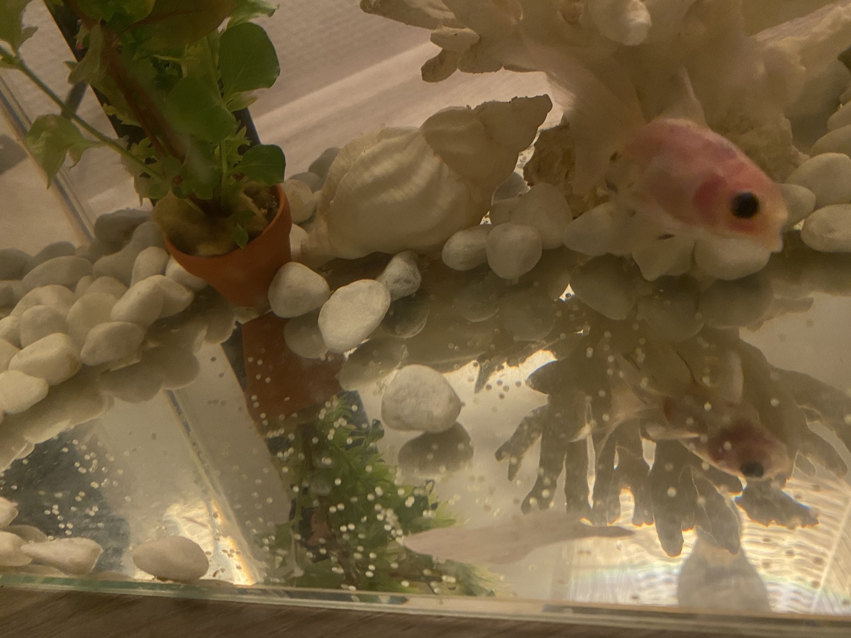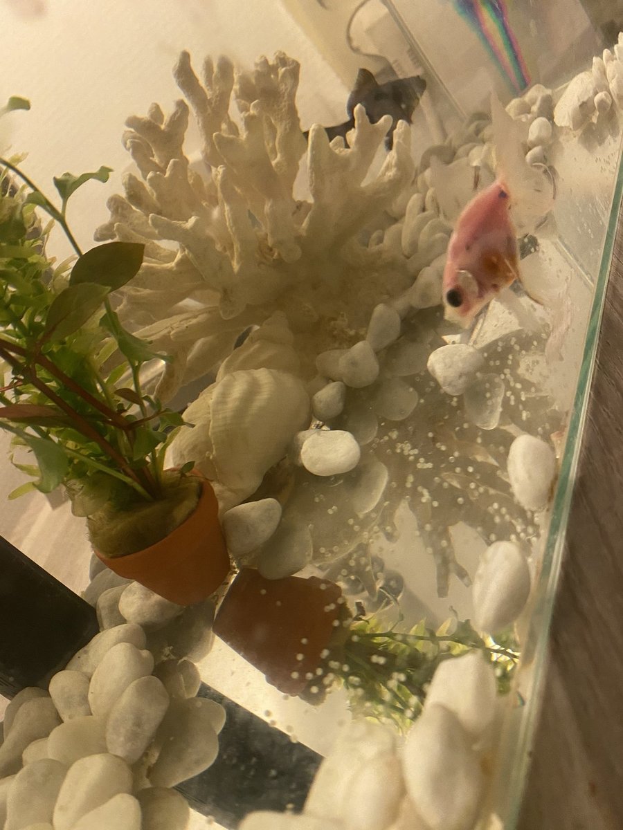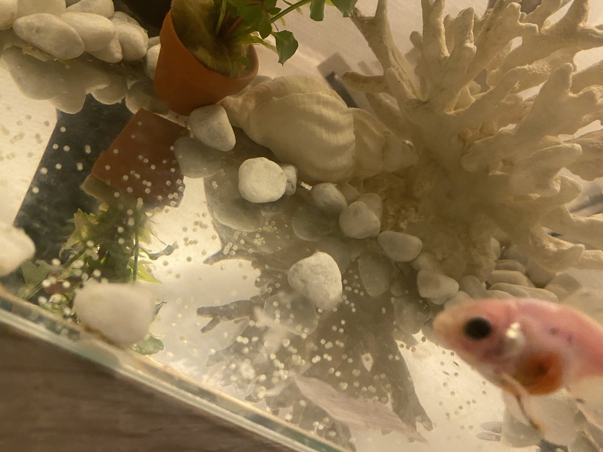 Op een begeven moment zag ik schade aan staart en vin bij de zwarte, dus heb ik de gevlekte even voor een klein uurtje apart gezet. En opeens zie ik daar allemaal eitjes liggen over de gehele bodem, plant, schelpen en kiezels. Direct de gevlekte weer teruggezet.