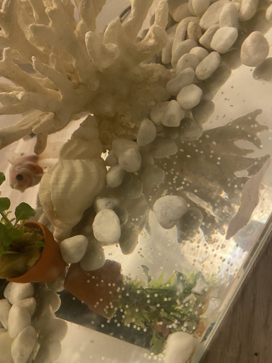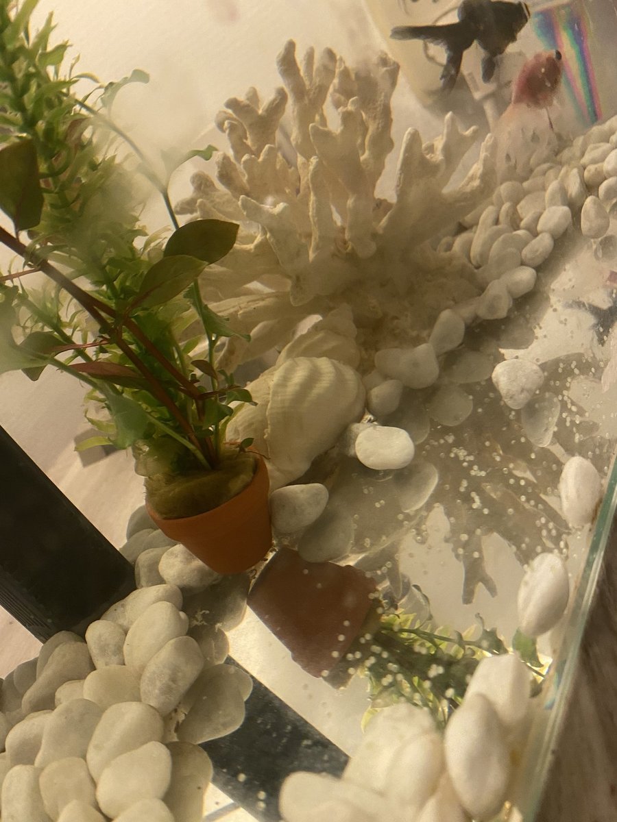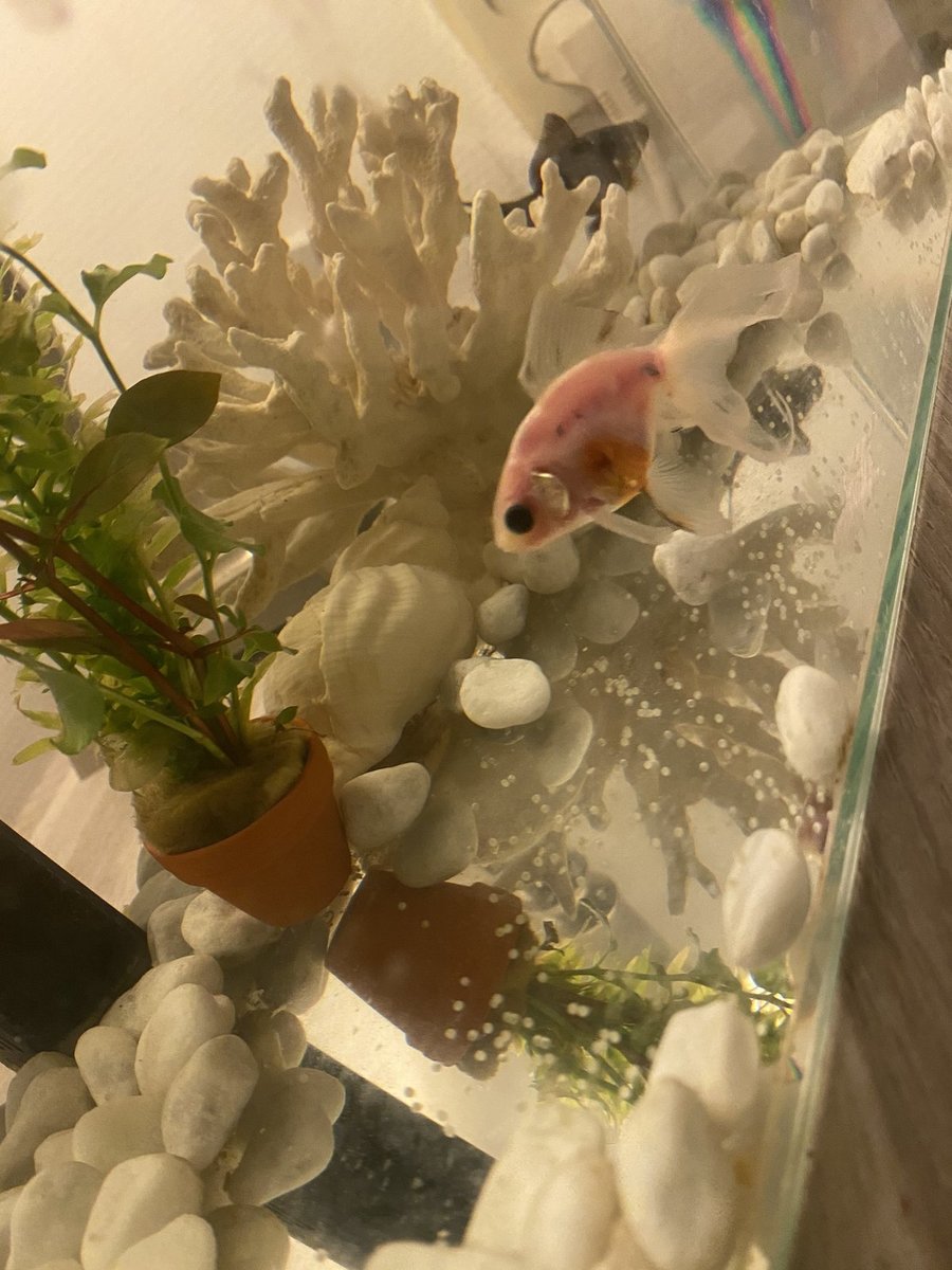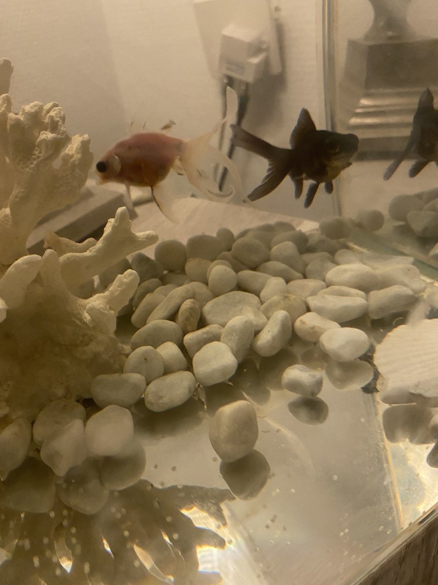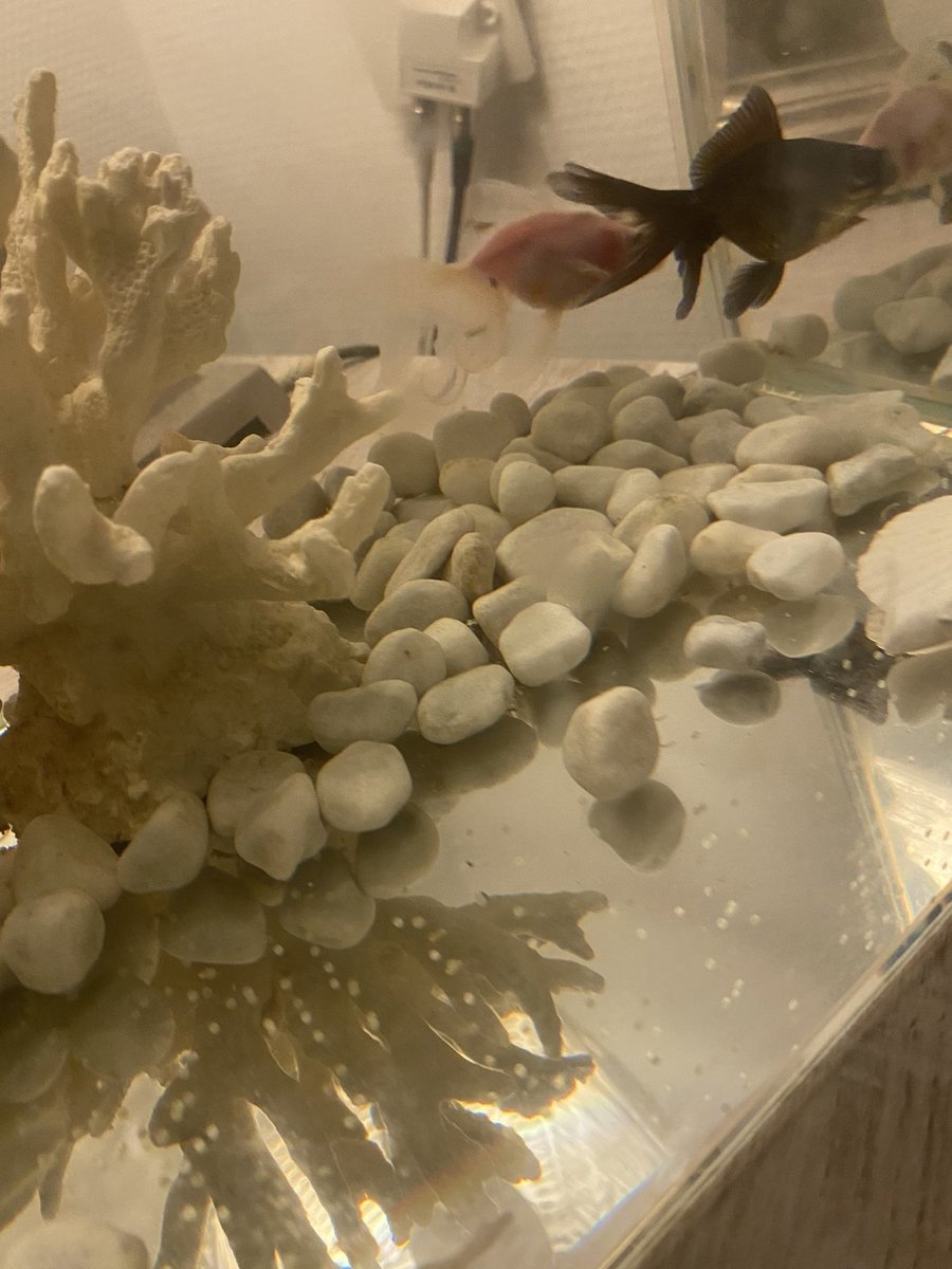 Op een begeven moment zag ik schade aan staart en vin bij de zwarte, dus heb ik de gevlekte even voor een klein uurtje apart gezet. En opeens zie ik daar allemaal eitjes liggen over de gehele bodem, plant, schelpen en kiezels. Direct de gevlekte weer teruggezet.