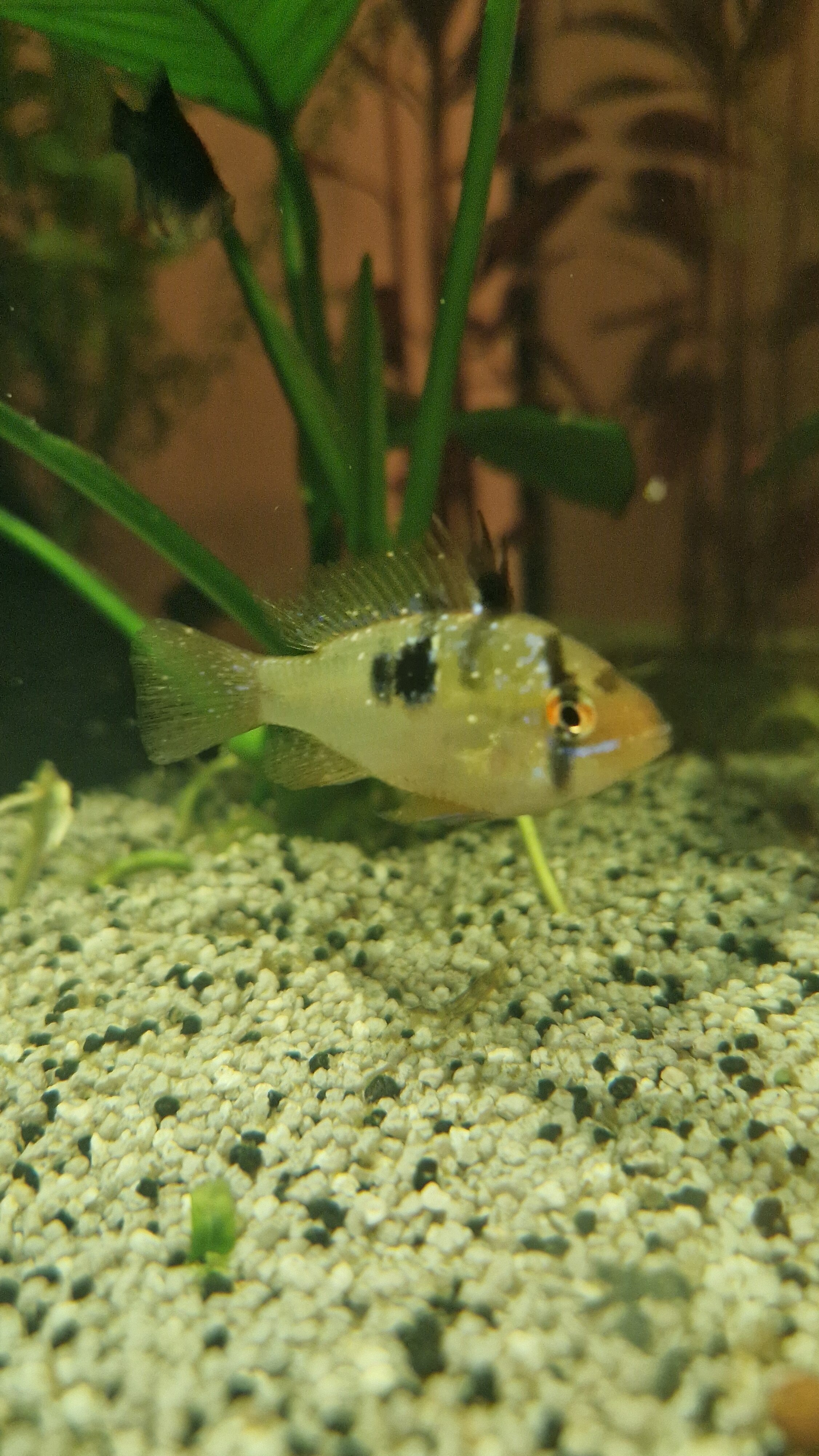 Sinds kort hebben wij wat nieuwe vissen in ons aquarium gedaan, deze zitten er nu zo'n 4 weken in. De oorspronkelijke bewoners hebben nu stip gekregen, dit zijn onze Ramirez vissen. Dit is te zien op de foto's, het water is nu wat groen gekleurd door de kuur die we hebben toegediend.