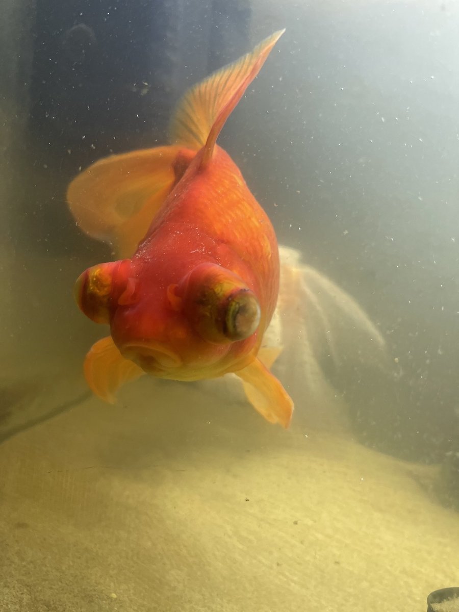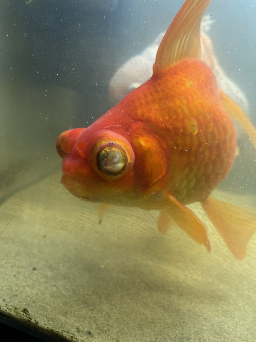 Hallo mijn telescoopoog sluierstaart heeft al een tijd iets in zijn oog en het word steeds erger.. onderstaande afbeelding is het oog.. ik maak mij hier erg zorgen over? Wat is dit en wat kan ik er aan doen? De vissen zitten in een groot aquarium zelf zijn de 2 sluierstaarten groot, de bak is groot genoeg voor de twee er staan GEEN scherpe beeldjes in het aquarium ook zijn de waterwaardes goed..
